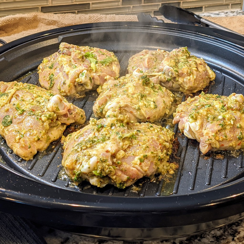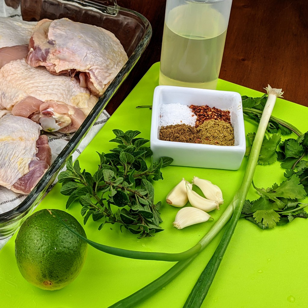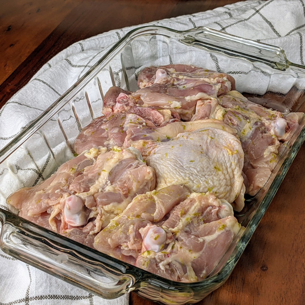 - 3 lbs. or 6 pieces of chicken thigh, bone in and skin on, excess skin and fat trimmed