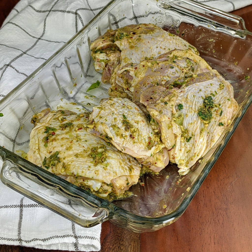 Pour the blended mixture over the chicken thighs. Make sure the chicken is well coated on both sides with the herb mixture. Leave the chicken to marinate for at least an hour. You can also marinate the chicken over night covered in the refrigerate overnight.