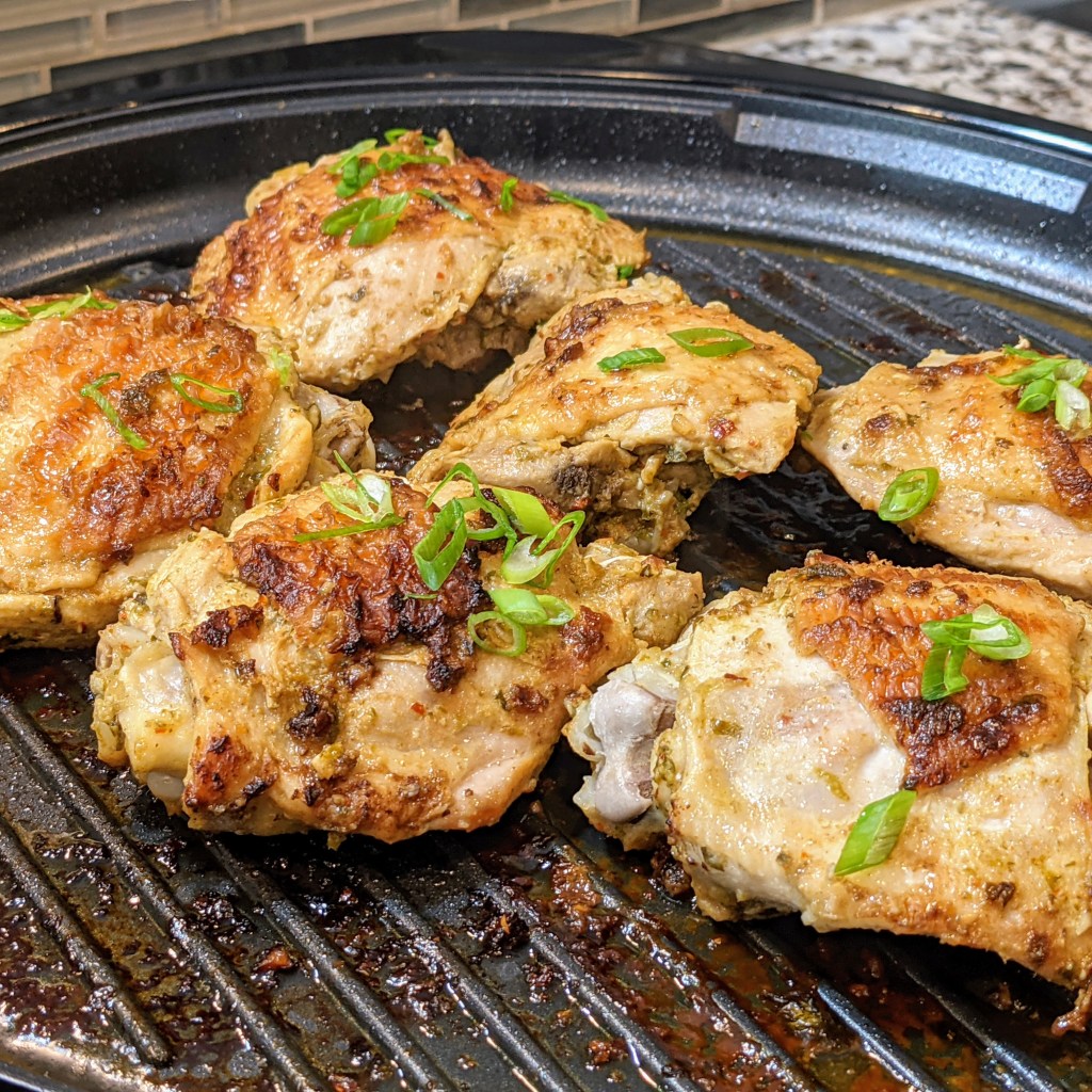 If you marinate the chicken overnight, make sure to bring out the chicken at least an hour before cooking. You can grill the chicken indoor, outdoor grill, or broil in the oven. This process can take 35 to 45 minutes depending on the thickness of the thighs or the type of cooking method you choose.