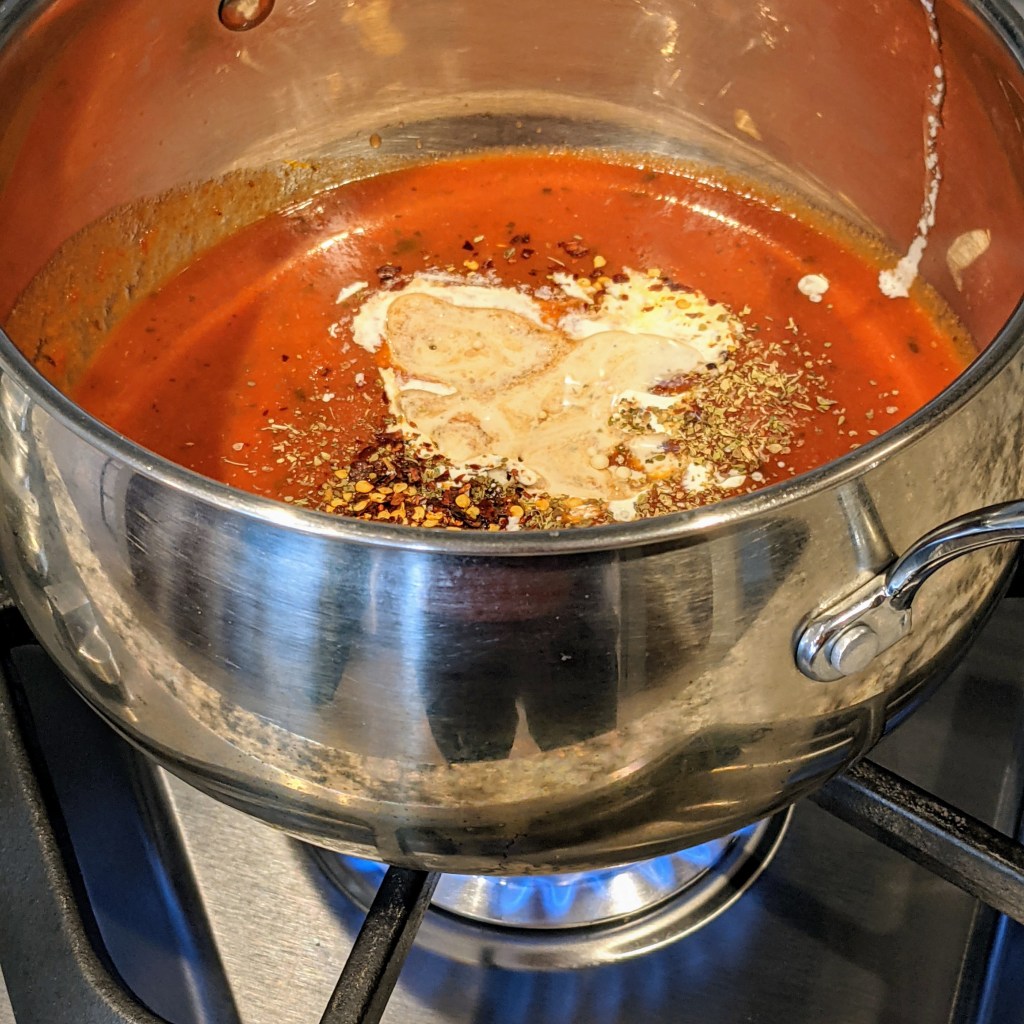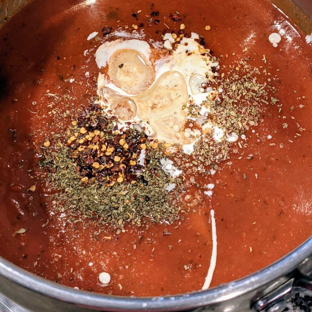 I’ve found two pasta sauces that haven’t disappointed me so far. Prego Traditional Italian Sauce and Trader Giotto’s Tomato Basil Marinara are both great bases to start with for your sauce. I, however, like to add my own twists to take it up a notch!
