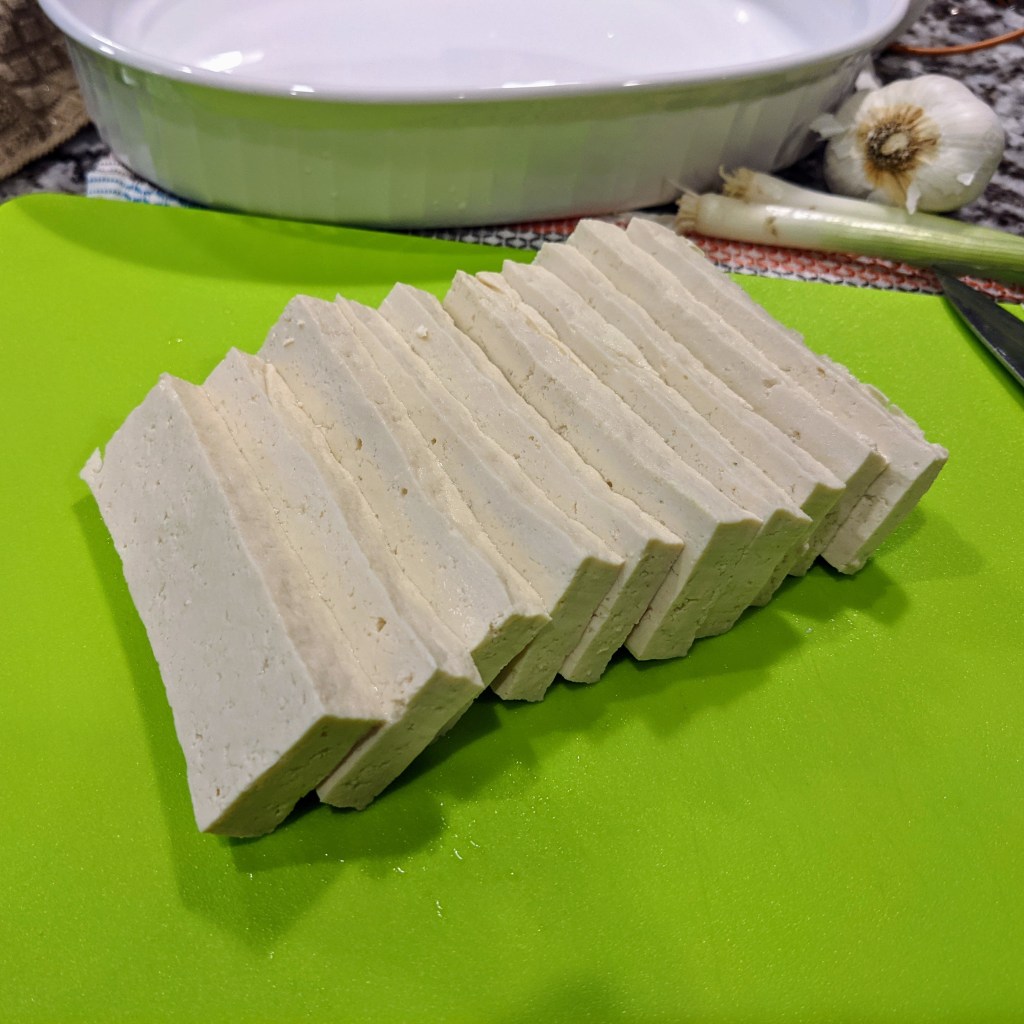 Drain package of tofu and pat dry with paper towel. Cut tofu into 10 pieces. I usually cut along the longer side of the tofu block.