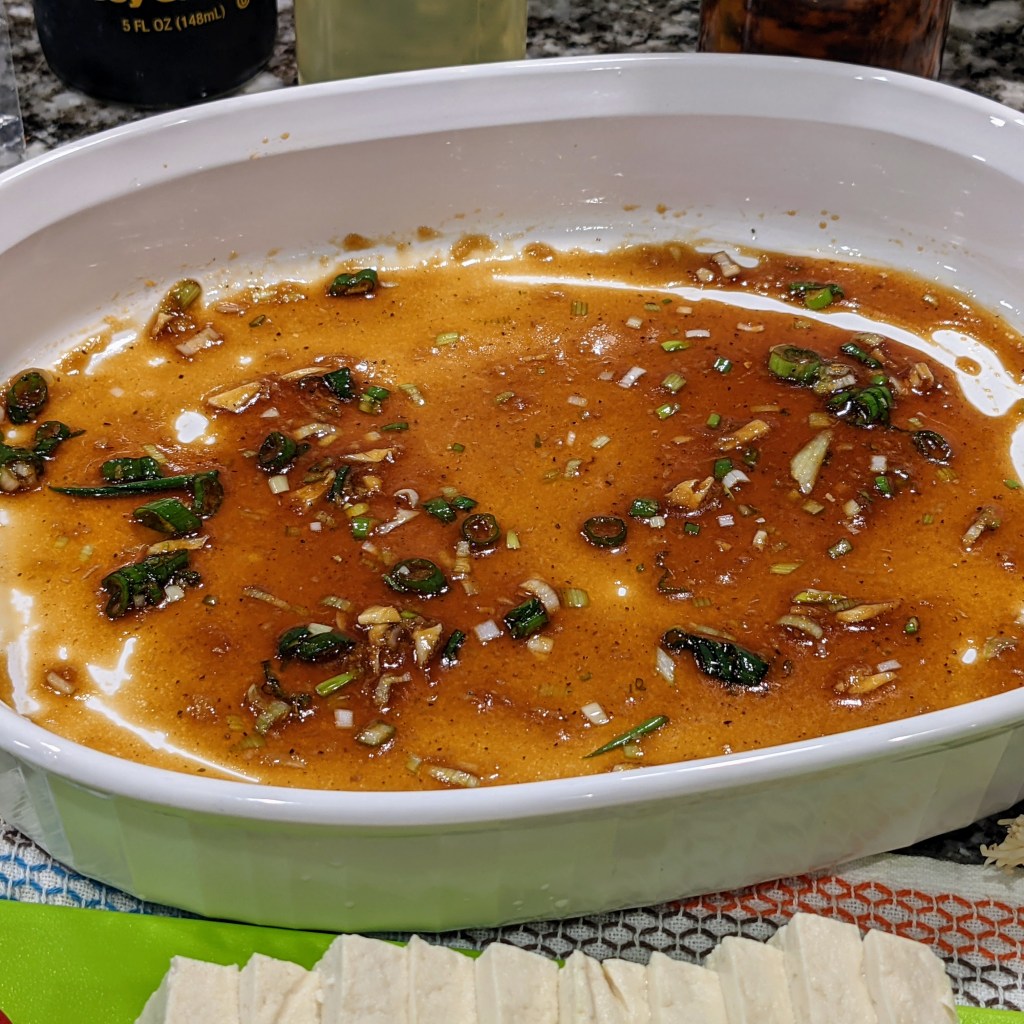 Mix all ingredients except tofu and canola oil in a shallow baking dish. Set aside.