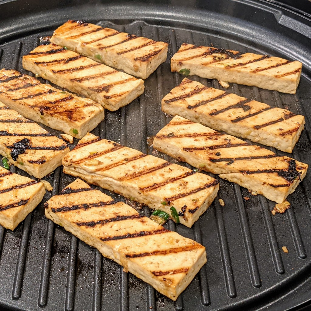 Heat a grill pan over medium-high heat. Drizzle around 1-1 1/2 tablespoons of canola oil over the grill pan. Add tofu slices on top of pan. Arrange them so tofu slices are laid diagonally for grill marks. Cook tofu until grill marks appear on surface. It should take around 2-3 minutes. Flip tofu over and repeat steps on other side.