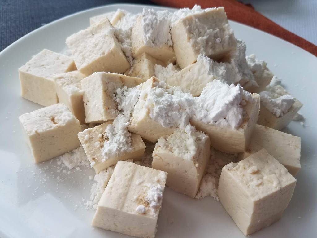 Mix cornstarch, salt, and pepper in a small bowl. Sprinkle over tofu. Gently coat the tofu in the cornstarch mixture.