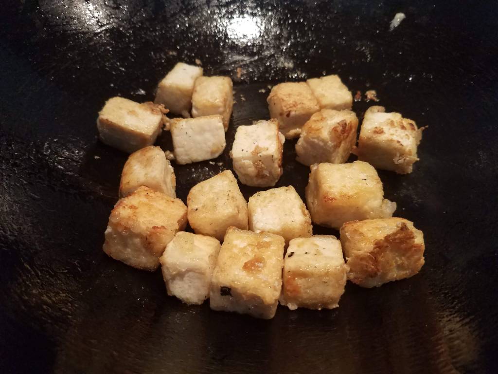 Heat 1 tbs oil in a large nonstick deep frying pan. Fry half of the tofu till lightly brown on all sides. Try not to overcrowd. Repeat with the remaining 1 tbs oil and rest of the tofu. Transfer to a plate. Set aside.