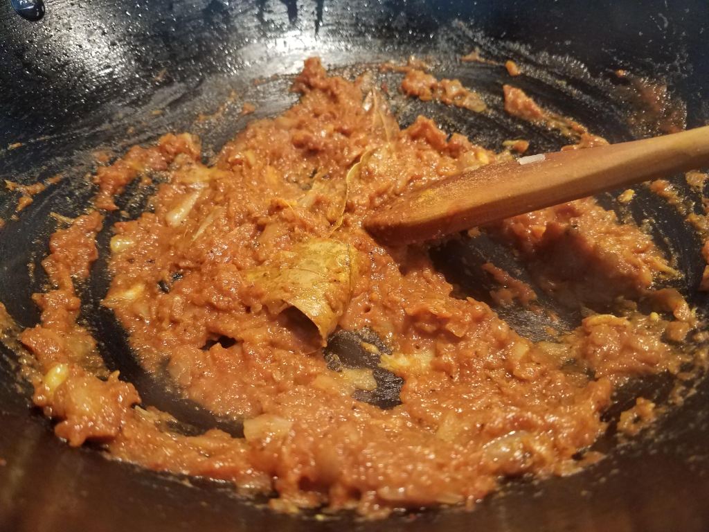 Heat oil in a large deep frying pan on medium-high heat. Add cinnamon leaves. Fry for a few seconds. Add grated onion. Fry till lightly colored. Add ginger, garlic. Fry for a few minutes.