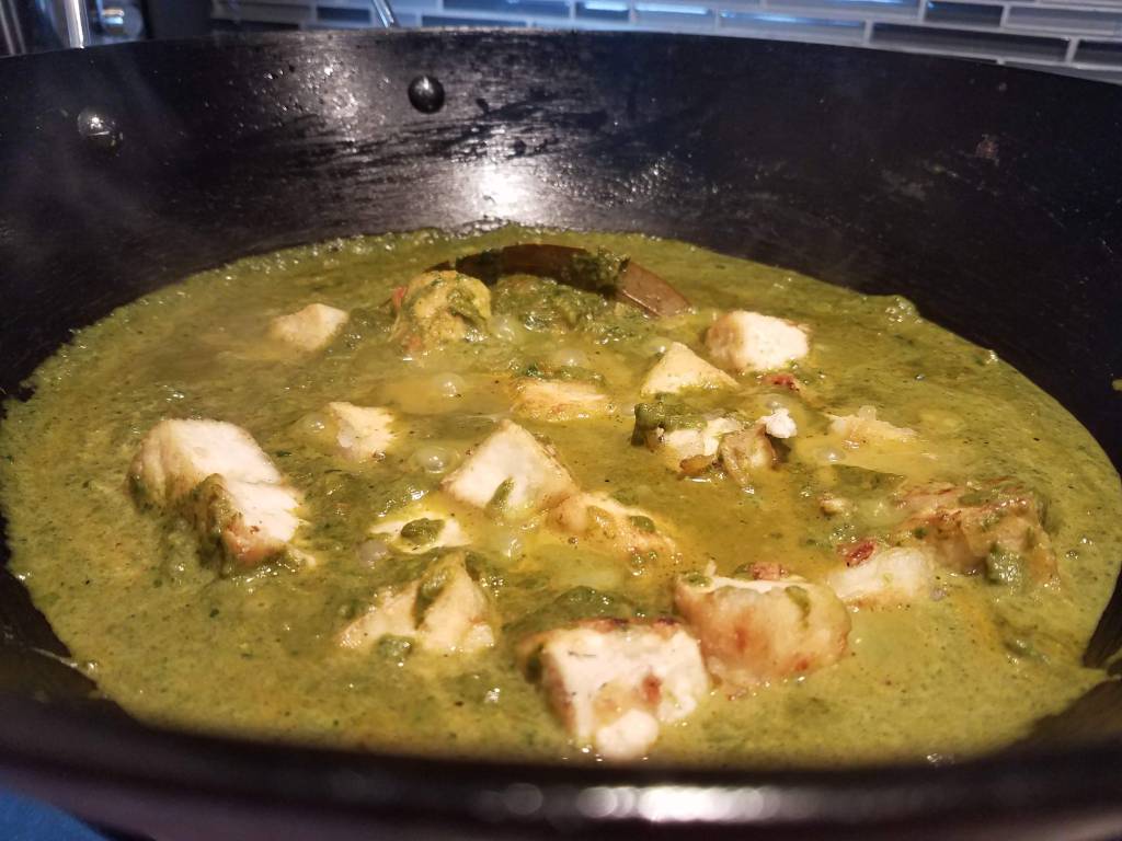 Today I present my take on spinach tofu. The key element is a puréed spinach seasoned with ginger, garlic, garam masala, and other spices. If you’ve ever heard of palak paneer, it’s a bit like that. I use tofu, however, and dust it with cornstarch and white pepper powder before frying it until crispy on the outside.