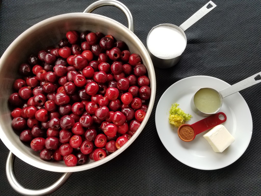 We picked so many cherries that I had a hard time knowing how to use them before they start to go bad. I therefore decided to make some home-made cherry pie filling. I will use this later for making bars, cobbler, and crisps.