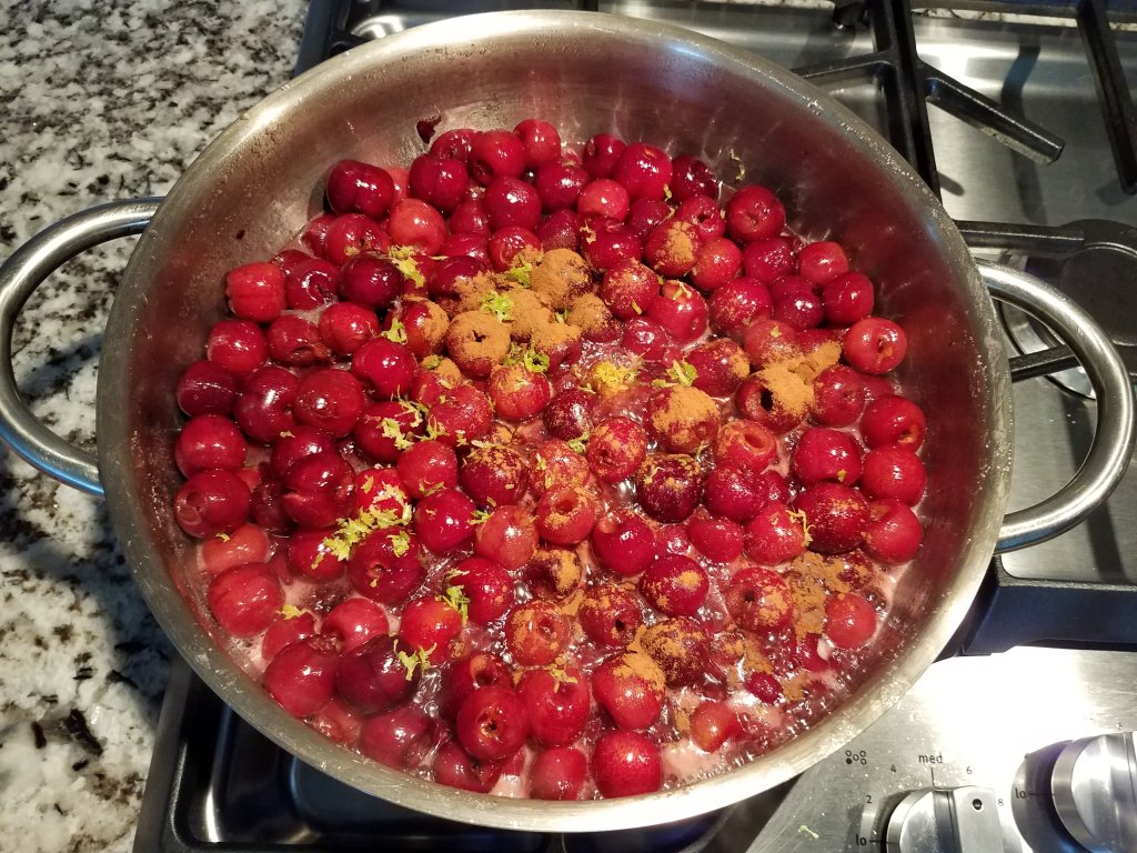 Turn down the heat and cook the cherries for 10-15 minutes. Keep stirring from time to time, so the bottom of the pan doesn’t scorch. Stir in the lemon juice, cinnamon, and lemon-lime zest. Stir thoroughly.