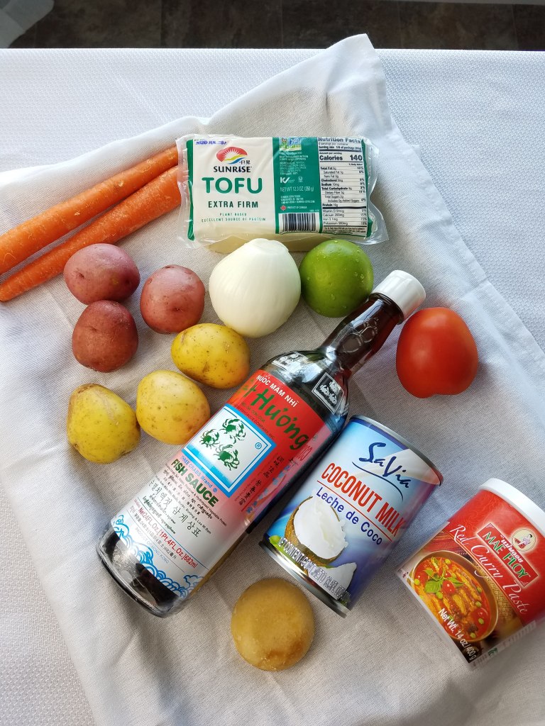 However, my husband recently requested a curry of some sort because our family loves these. I decided to make Thai red curry with tofu. Thai curry is easy to make if you start with a good curry paste or base. To this you add fish sauce, lime juice, sugar, and coconut milk.