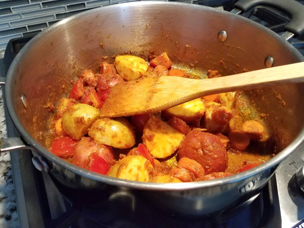 Add in the potatoes, tomatoes, and carrots. Stir and cook for 2-3 minutes on medium heat. Continue to stir.