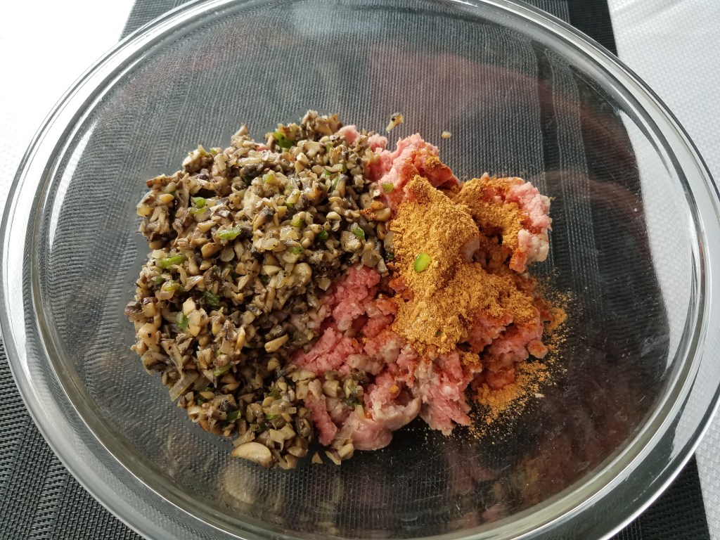 In a large bowl, add ground beef, cooled mushroom mixture, taco seasoning, and beaten egg. Mix all ingredients gently. Try not to over mix.