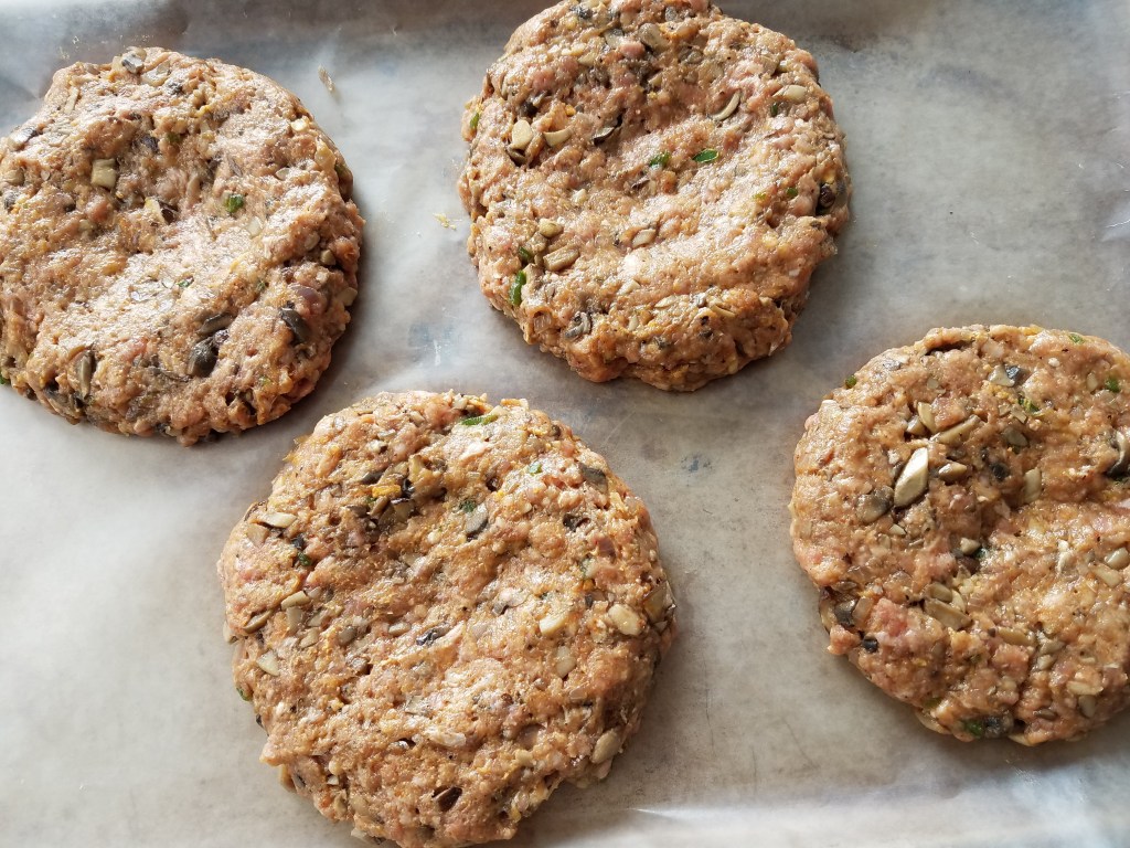 Form this mixture into 4 patties. The thickness of the burgers is up to you. Make the burgers slightly larger than the buns you will use. Keep the patties a parchment-lined sheet pan while the grill gets hot.