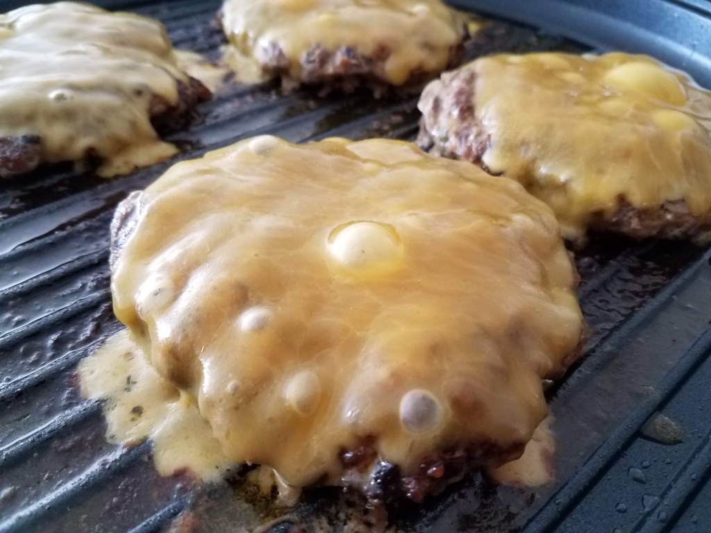 Heat an indoor electric grill to about 450 degrees Fahrenheit. Lightly brush the grill grate with oil or cooking spray. Cook the burger to your preference. I cook mine medium-well. Cooking takes around 5-8 minutes depending on the thickness of your burger. Place cheese on top of the burger patty during the very last minute of cooking. Cover and turn off the grill. Once the cheese is melted, remove the cover.