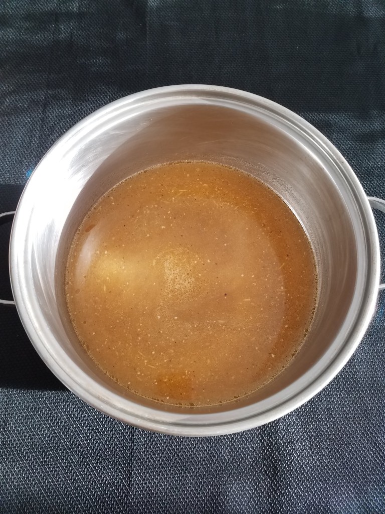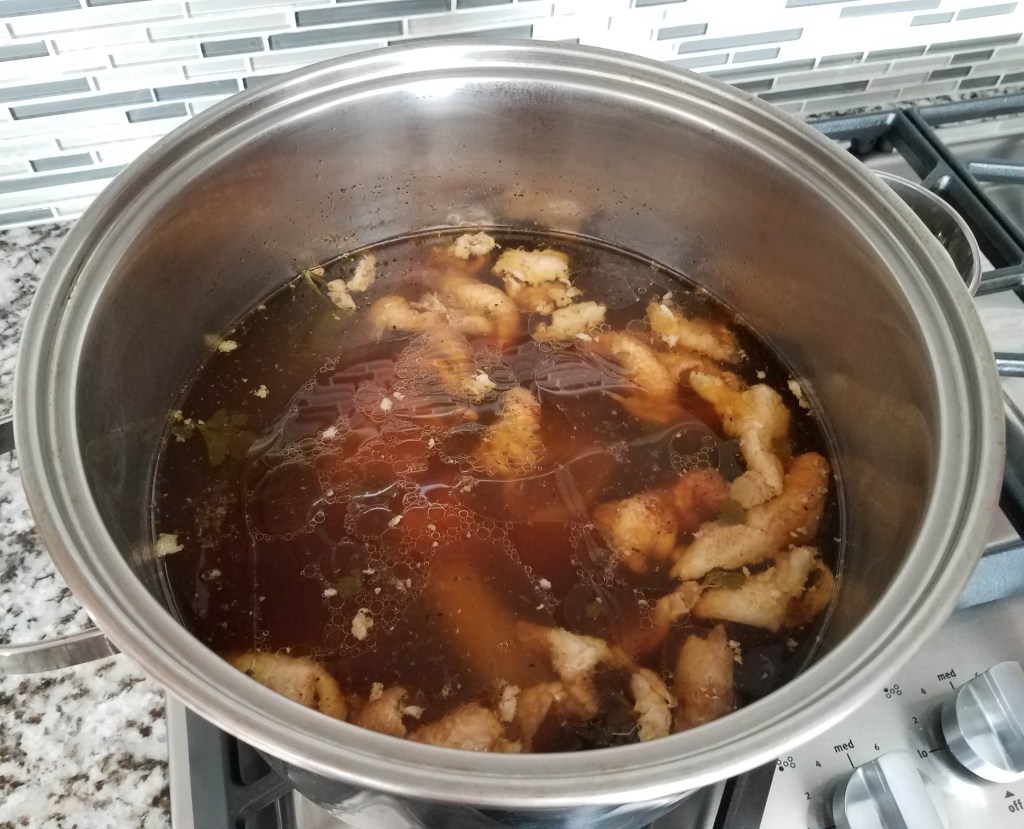 I used the bones and skin from two rotisserie chickens that I bought last week in the store. You will see that my chicken stock has a deep orange color to it. It came from adding soy sauce, pureed onions, carrots, and celery. You can eat this chicken stock as a soup. Or you can add a few vegetable leaves like spinach, water cress, bok choy, or savory cabbage. Sprinkle with green onions, chives, or cilantro leaf and you’ve got something truly great.
