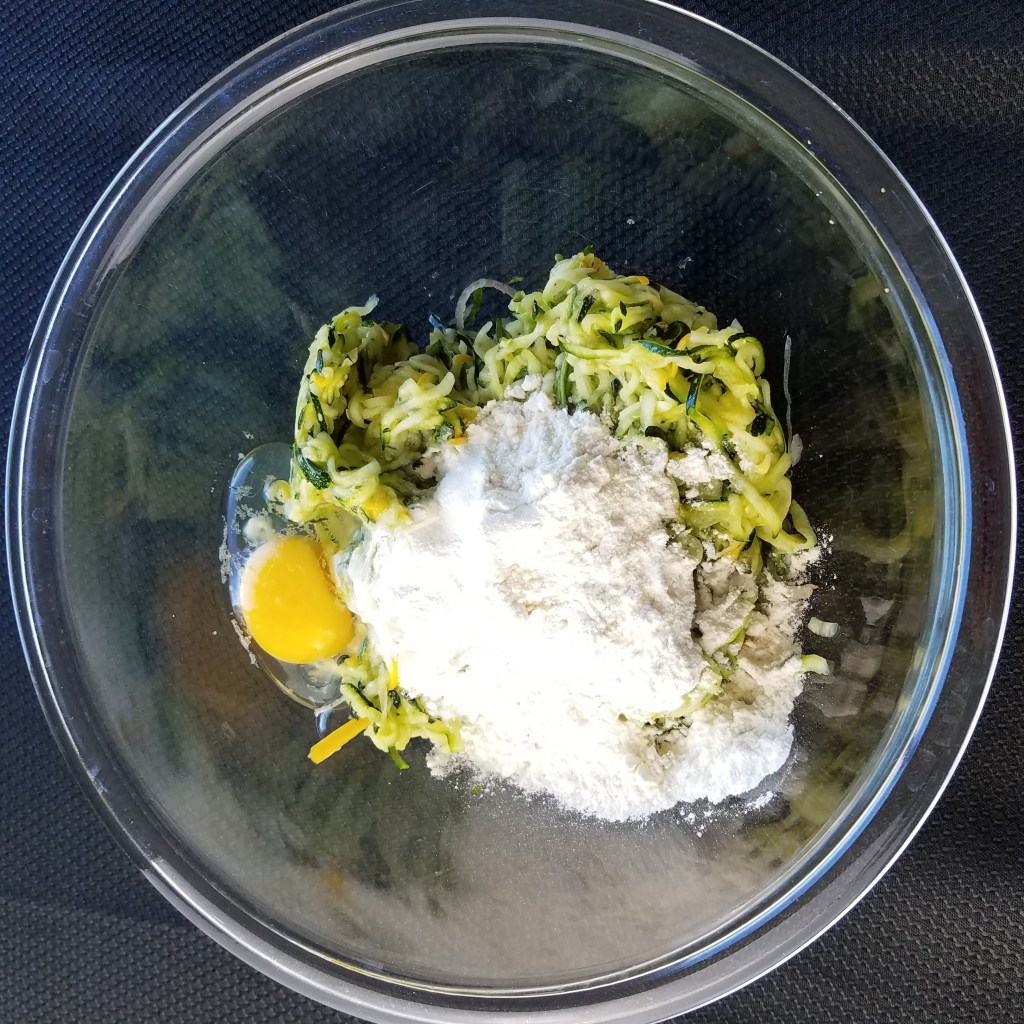 Add the zucchini along with an egg and flour to the bowl. Mix all ingredients well.