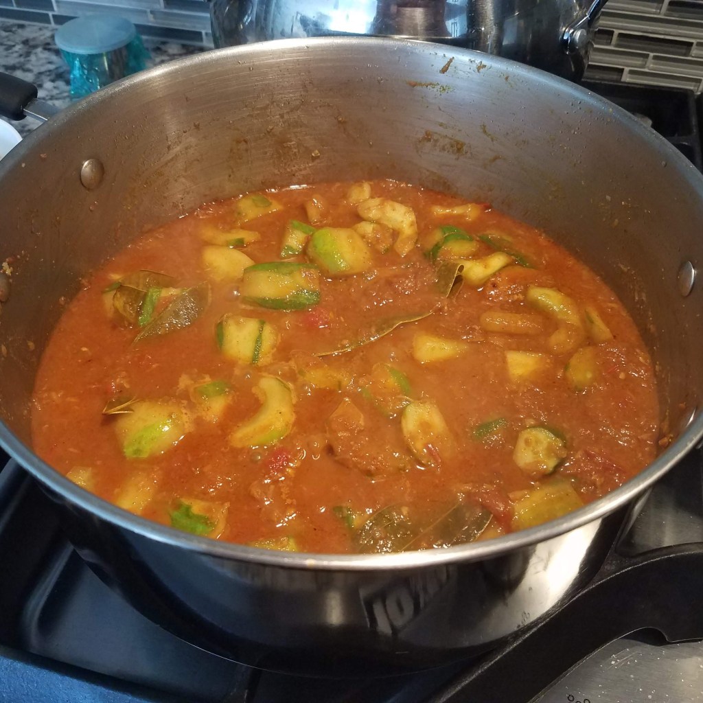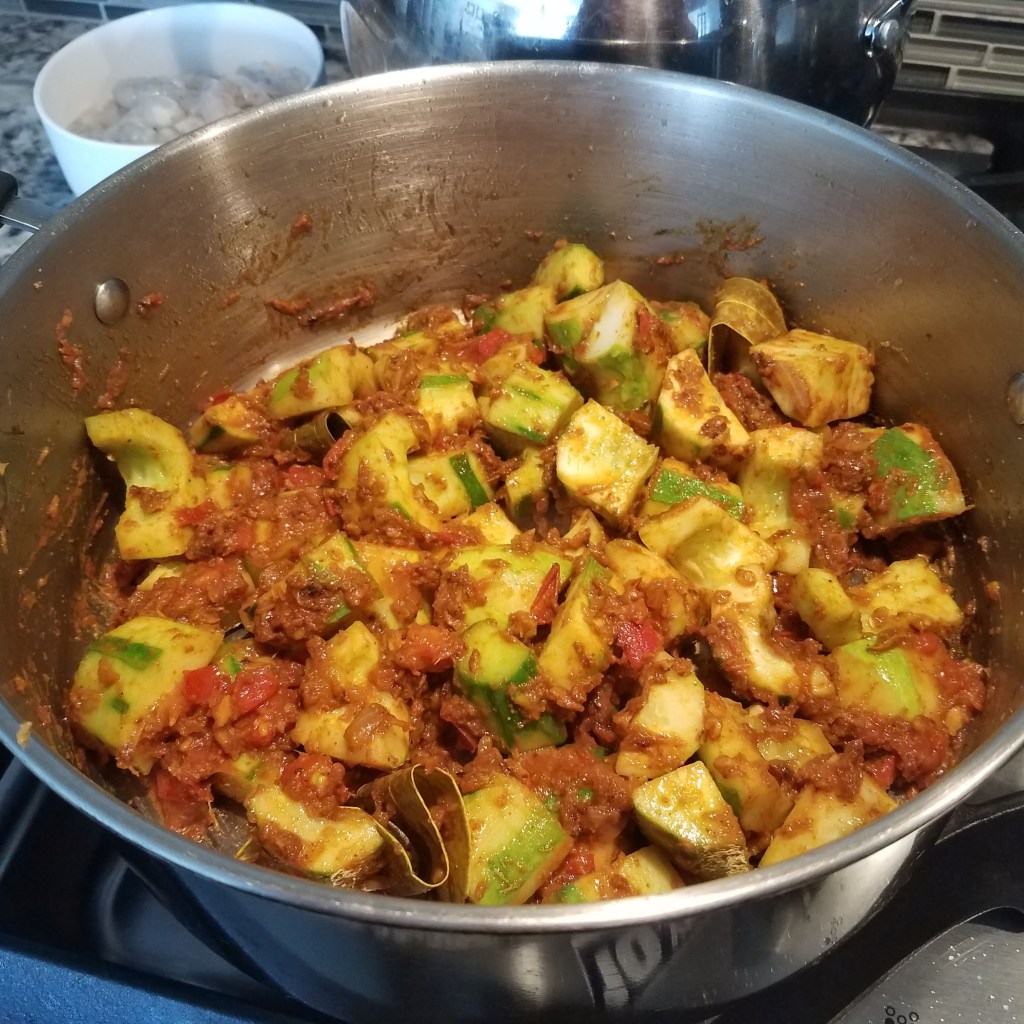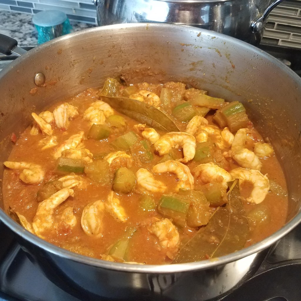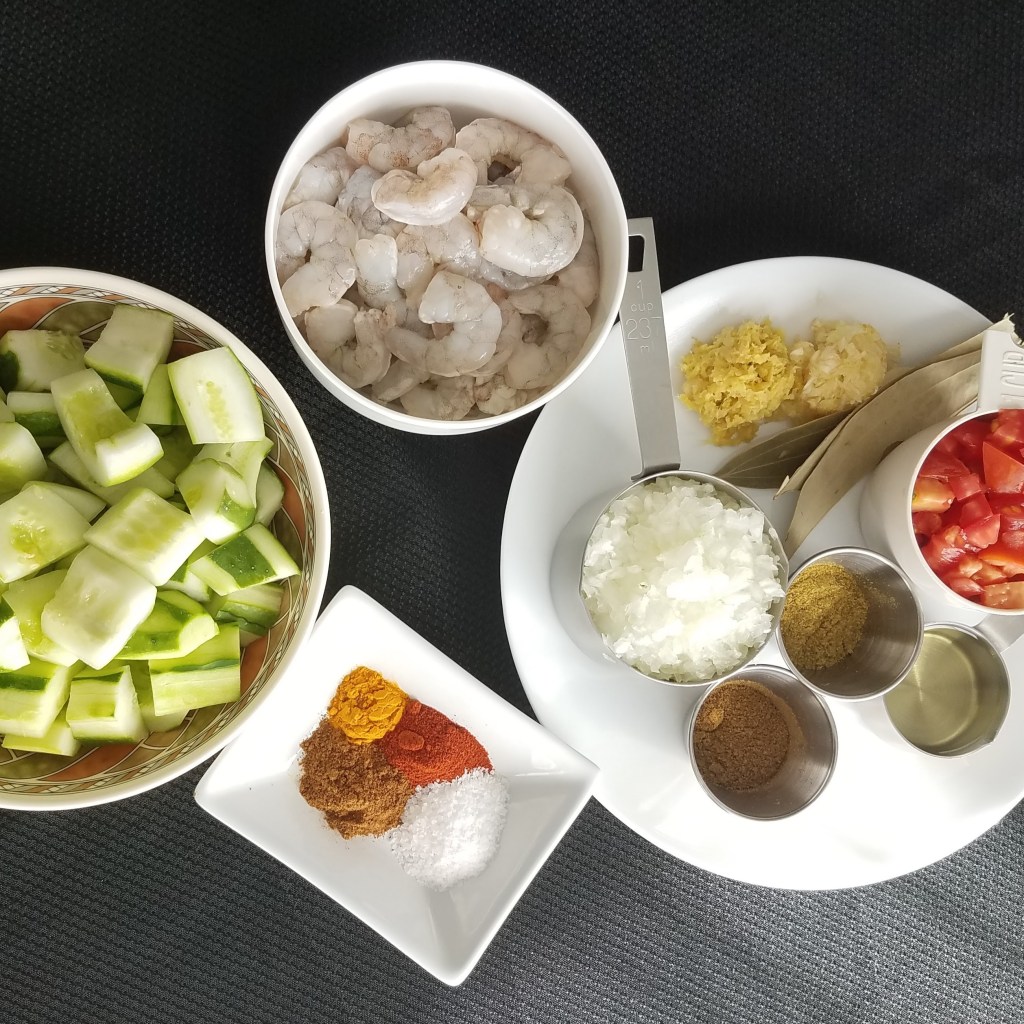 Today I will be making shrimp curry with cucumber. I have a lot of cucumber on hand from my garden. In Bangladesh this same dish is called Lau Chingri and is made with bottle gourd – a pale green vegetable shaped like a bowling pin. Lau Chingri is a Bengali delicacy. Since I don’t have any Lau (bottle gourd) on hand, I substitute cucumber since they taste similar when cooked.