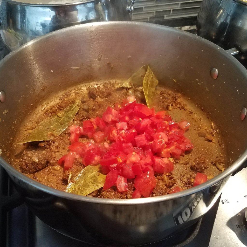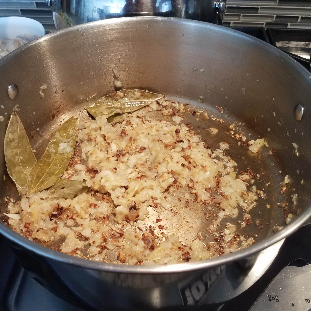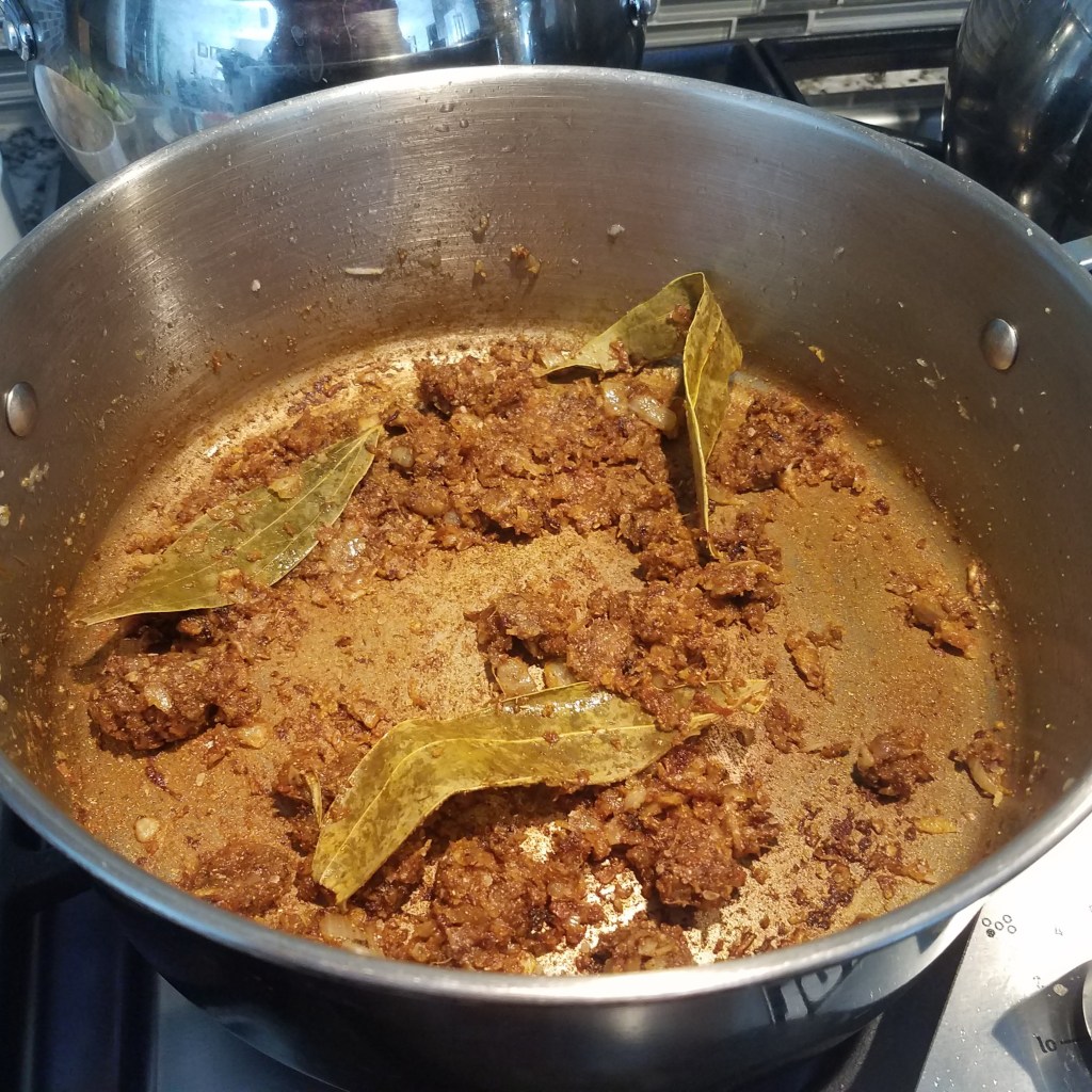Heat oil in a large sauce pan over medium-high heat. Add in cinnamon leaves and fry for few seconds. Add onion, ginger, and garlic. Fry the mixture until you see brown bits forming and the raw onion smells are gone. Turn down the heat to medium-low. Add in the curry spice and fry for about a minute. Add 1/4 cup of water and cook for 3-5 minutes. Don’t let the mixture burn!
