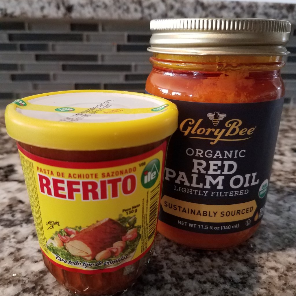 Sometimes I lose track of what is in my pantry. I periodically must go in and dig around to see what I have on hand. This last time I rediscovered a couple of things that a dear friend brought for me from Ecuador several months back. One of them was a jar of refrito paste, which is a form of spice paste that has a number of ingredients including Annatto powder. Another was a jar of red palm oil, something I had never bought or cooked with before.