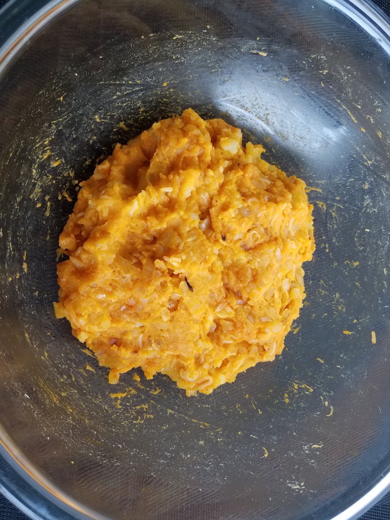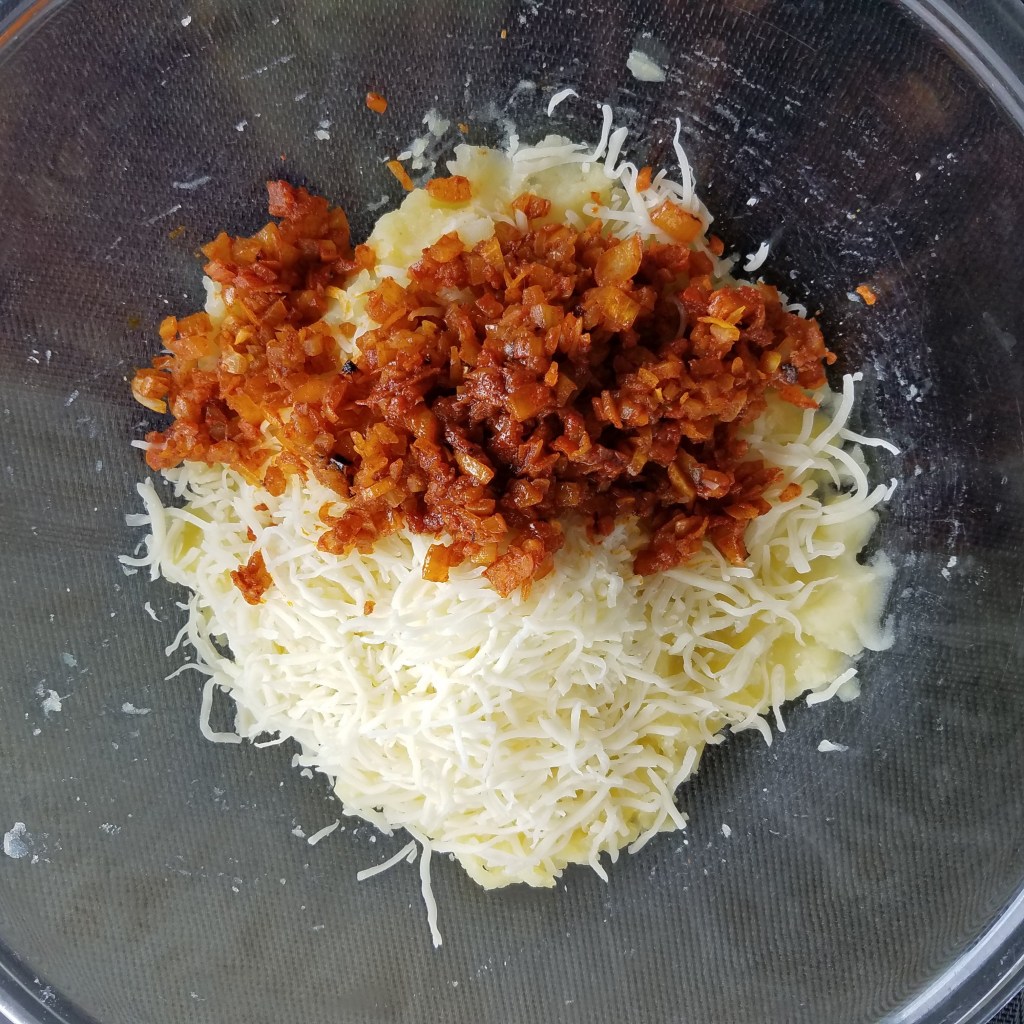Mash potatoes with a fork and transfer it to a large mixing bowl. Add onion mixture and cheese, then mix all ingredients together.