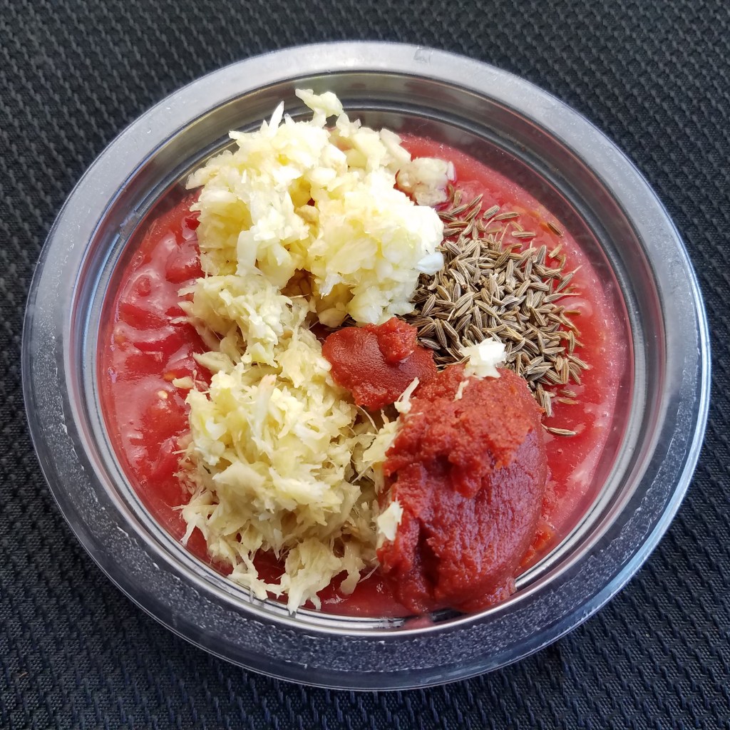 Mix the pureed tomatoes, ginger, garlic, tomato paste, and cumin seeds in a bowl. Set aside.