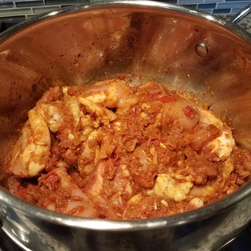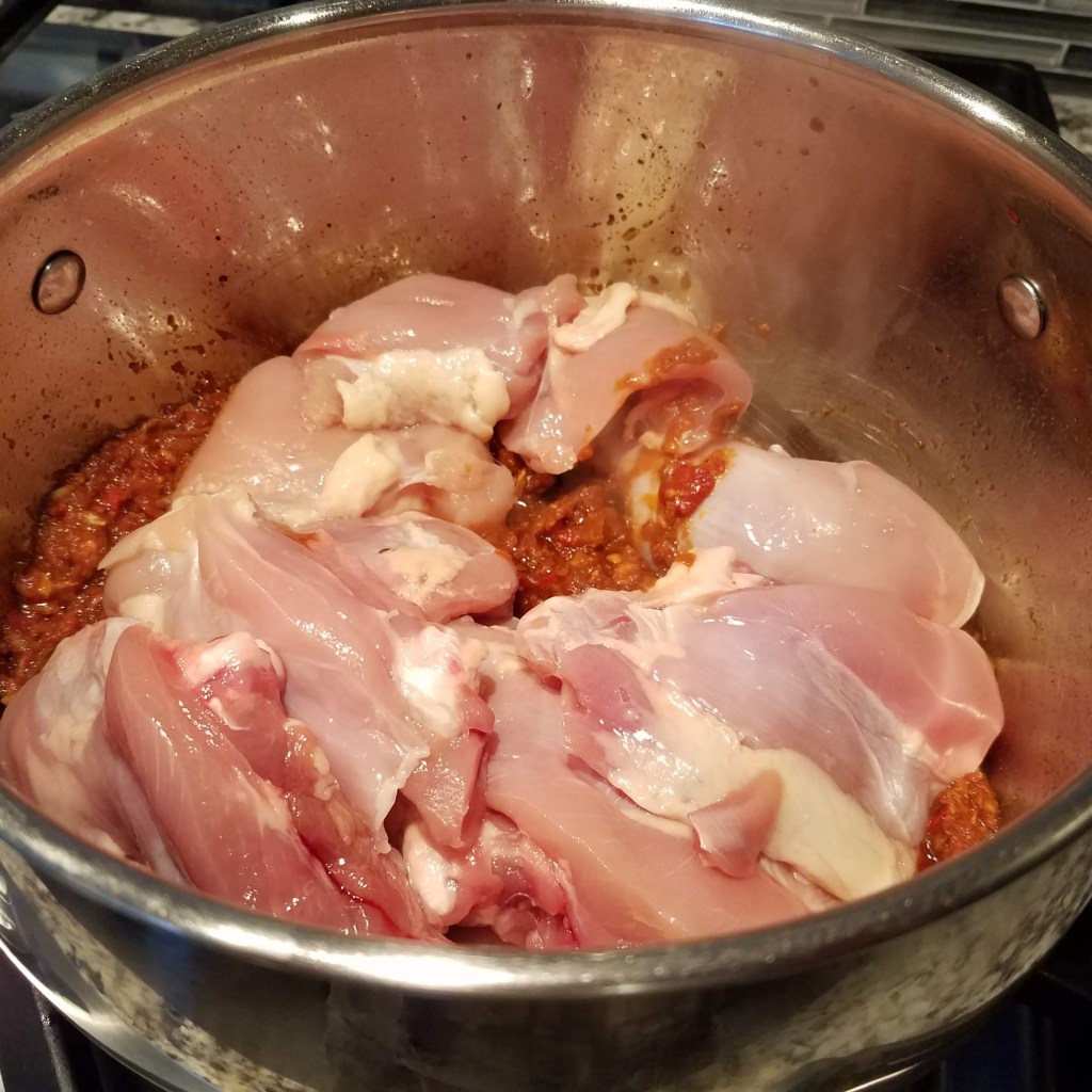 Add chicken pieces. Stir well to incorporate the chicken with spices. Cook for 5 minutes, stirring so the spices do not stick to the bottom of the pan.