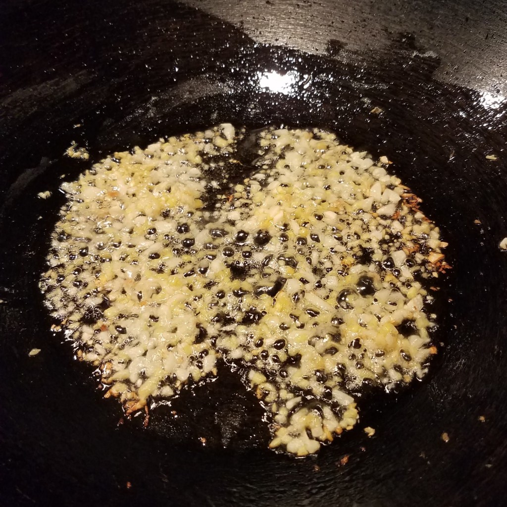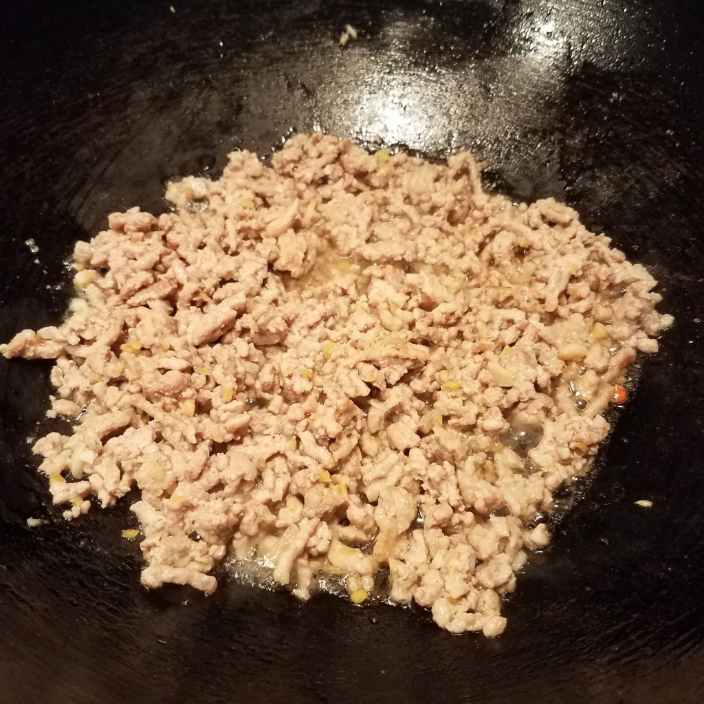 Increase the heat to medium high and add another tbsp. of oil to the skillet. Add garlic and ginger, cook for 30 seconds, and make sure not to let them burn. Add pork, cook until done about 3-5 minutes, add frozen veggies, then stir-fry for couple of minutes.