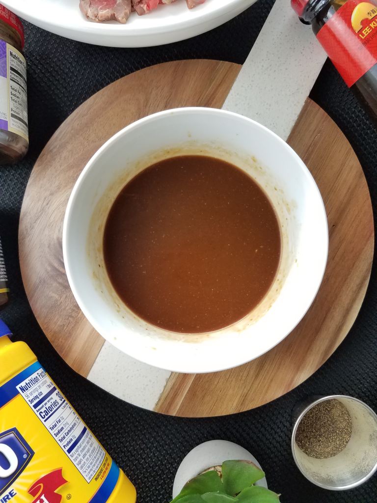 - 1 tbsp. each oyster sauce, soy sauce, beef seasoning, hoisin sauce, and cornstarch