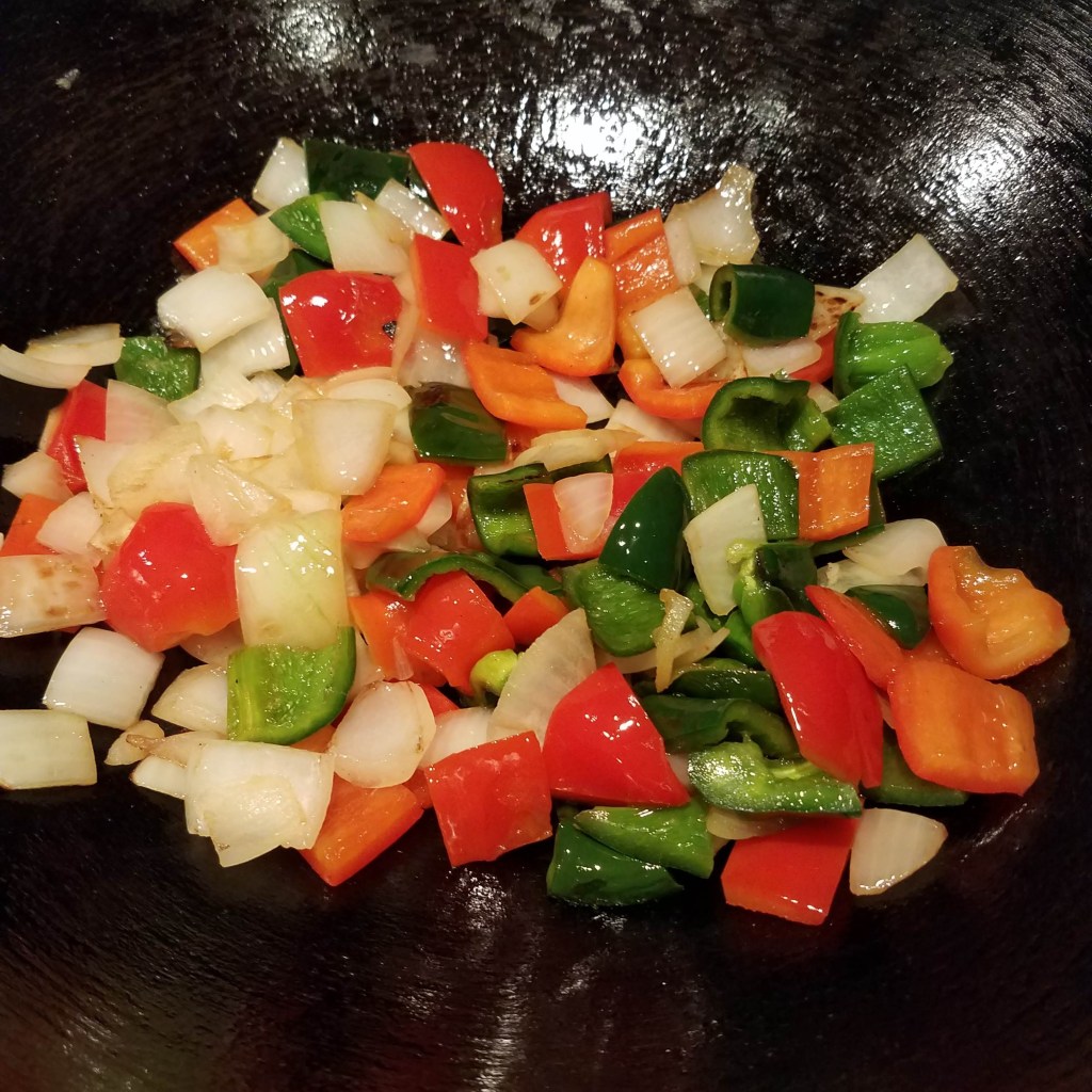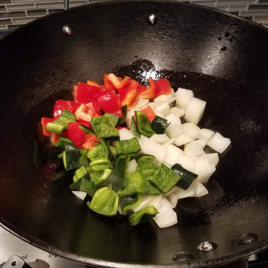 Heat a large wok over a high-heat. Add 1 tbsp. of oil to the wok. When the oil is hot, add onions and peppers to the wok. Cook until the onions and peppers are slightly char on the edges. This will take about 2-3 minutes. Remove from the pan and transfer it to a plate.