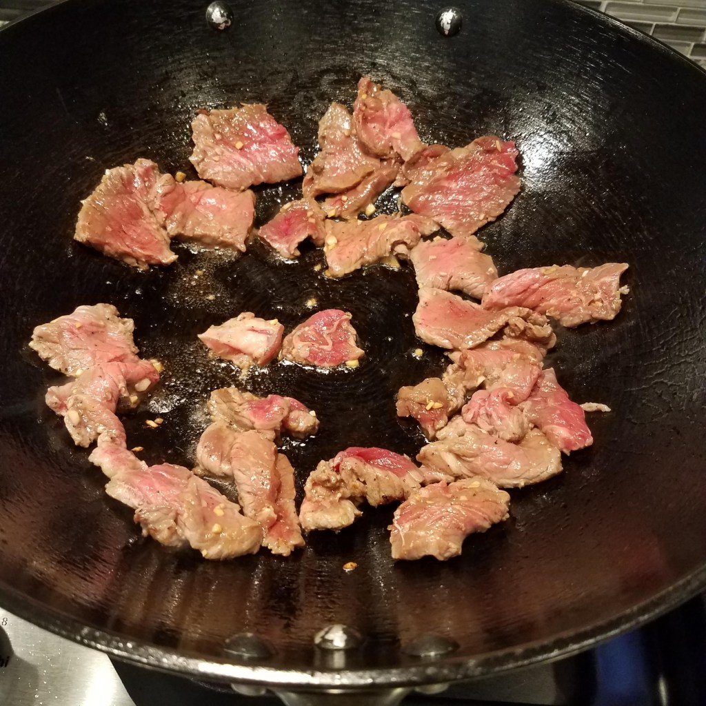 Heat another 1 tbsp. oil to the same wok. Add marinated steak in a single layer, working in batches if needed, and cook until seared on both sides. Remove steak and set aside.