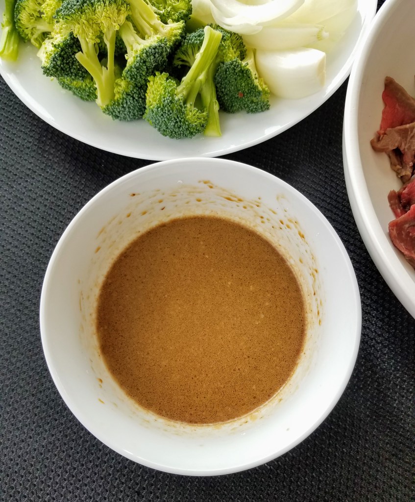 Add another tbsp. of oil to the wok. Add the other 1 tsp. each ginger and garlic. Cook for 30 seconds, then add the sauce ingredients to the wok. Turn down the heat to low and stir very well. Once the sauce is thickened lightly, add the beef, broccoli, and onions to the work. Then stir and turn off the heat.