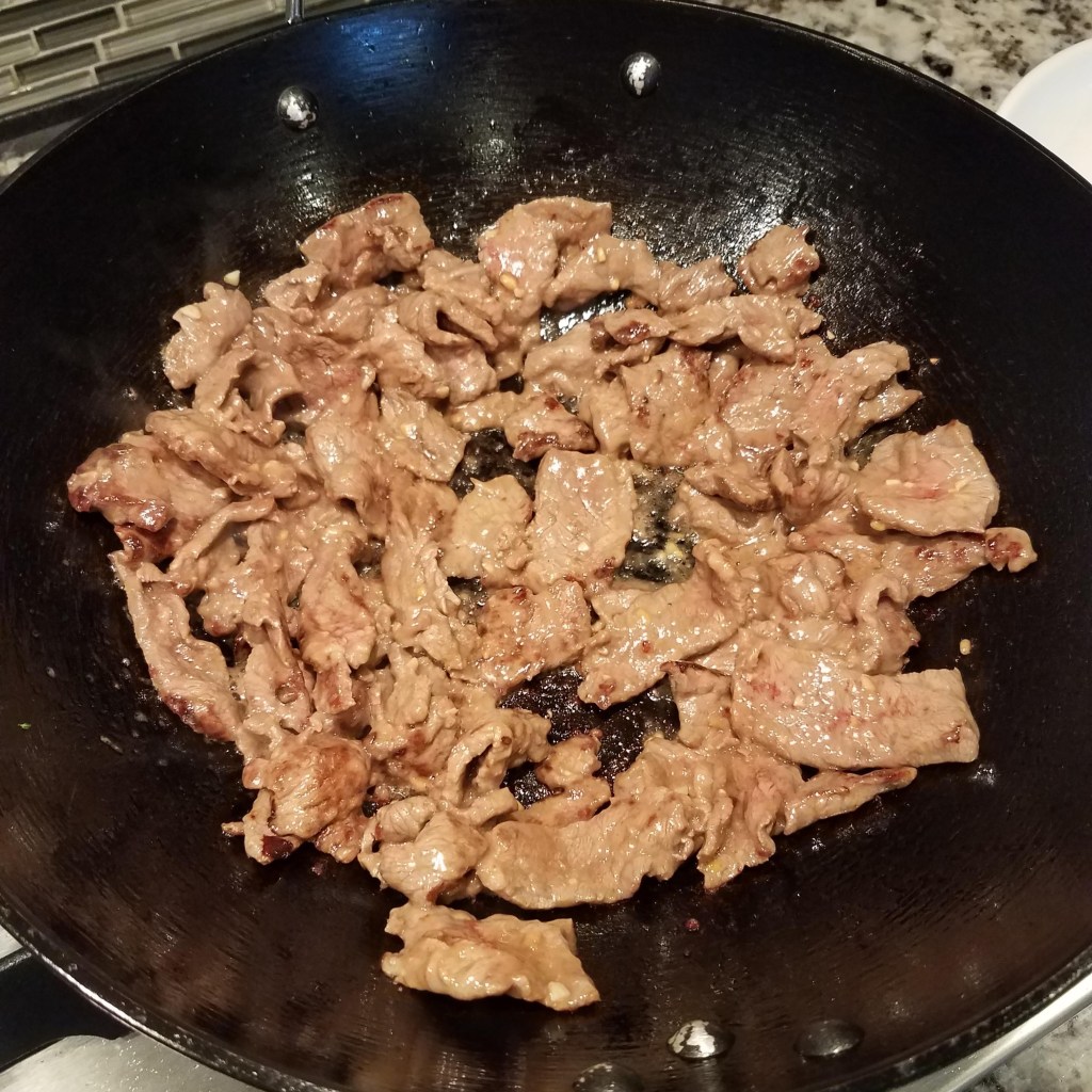 Heat another 1 tbsp. oil to the same wok. Working in batches, cook the beef in a single layer until seared on both side, 1-2 minutes per side. Then, remove the steak and set aside.