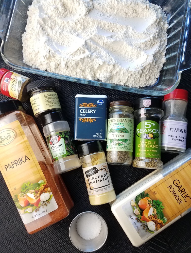 - 1 tsp. each dried thyme, oregano, basil, paprika, poultry seasoning, white pepper powder, mustard powder, onion powder, salt, celery seed