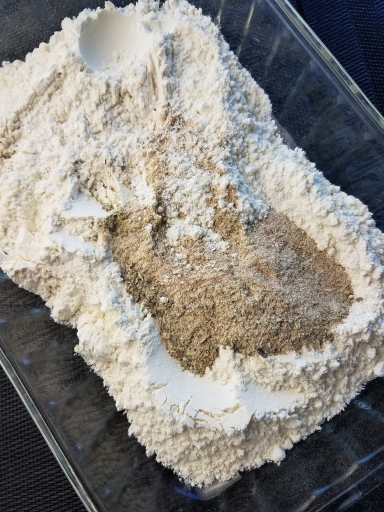In a separate large casserole dish, combine all dredge ingredients. Drizzle 3-4 tbsp. of the buttermilk marinade into the dredge mixture. Use a fork to mix.