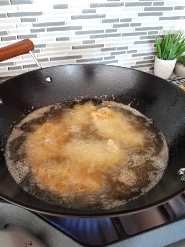 Heat oil in a large deep pot or wok at 350 degrees. Working in small batches, flipping in between several times for even browning, cook the chicken until golden brown for around 3-5 minutes and when the internal temperature reaches 165 degrees. Cook time will vary depending on the thickness of the chicken pieces.