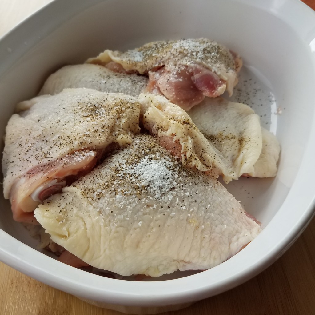 - 3 lbs. whole chicken, cut up or 6 pieces of chicken thigh, excess skin around the pieces trimmed