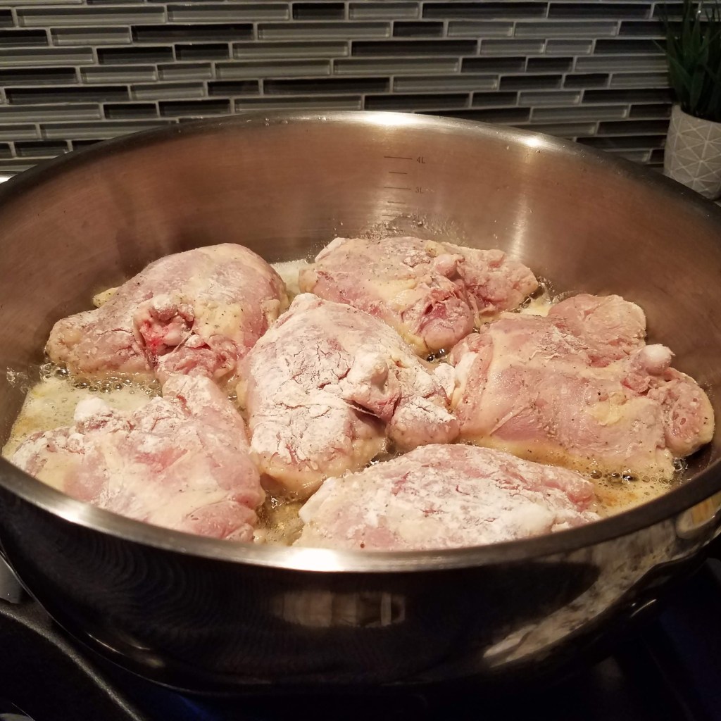 In a separate shallow baking dish mix flour, salt, and pepper. Taking one piece of chicken at a time, flour the chicken on both sides, making sure to shake of the excess flour, and set aside. Save 3 tbsp. of flour and discard rest.