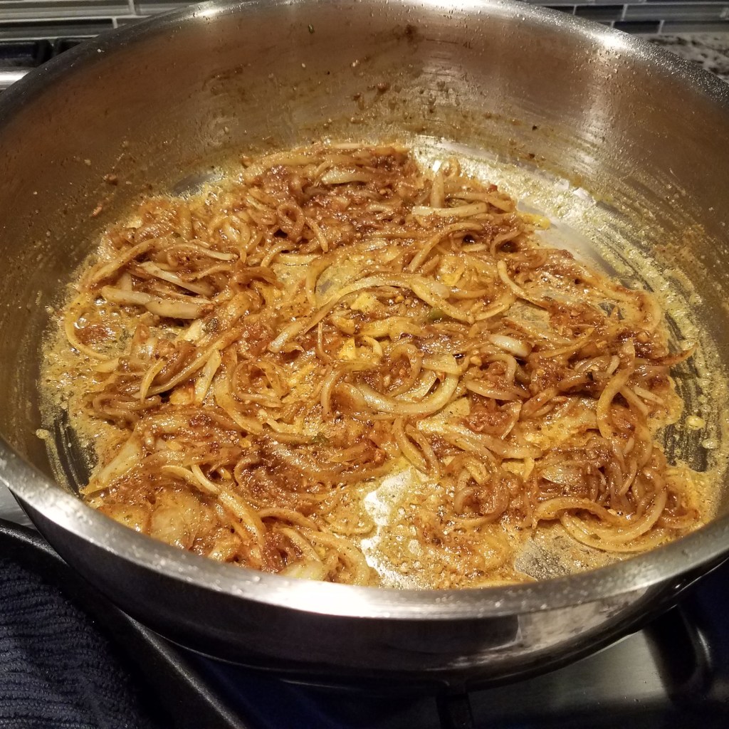 Turn the heat down to medium. Add onions to the remaining fat and sauté until light brown. Add ginger, garlic, and jalapeno to the onion mixture. Cook this until onions are golden brown. Add curry powder to the pan and fry for about 30 seconds.