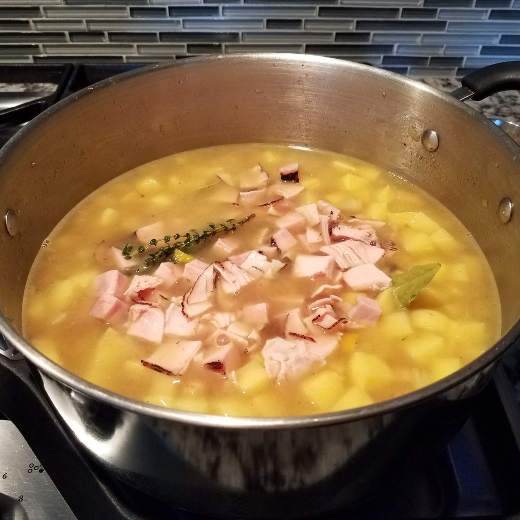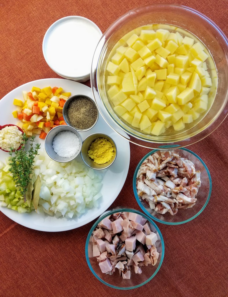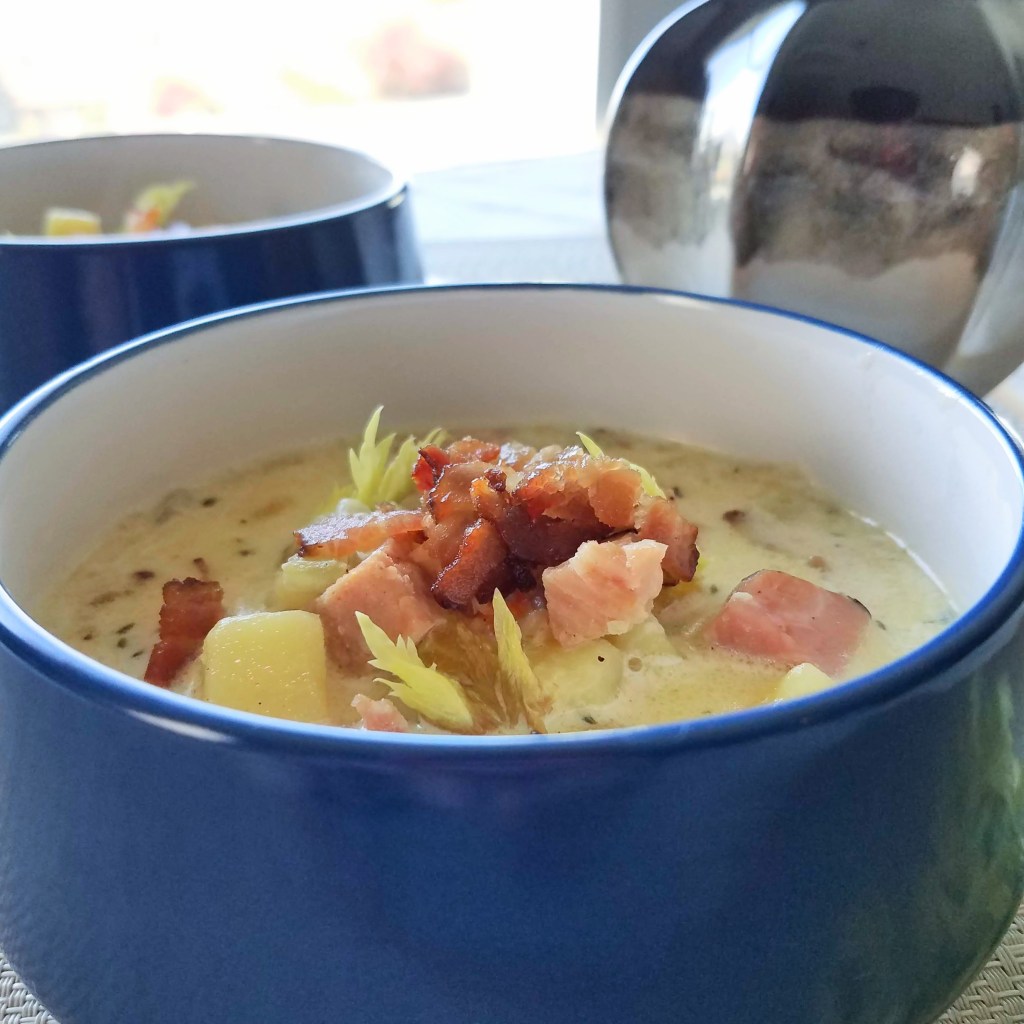 I don’t generally add roux (a thickener) to my soups. The creaminess in this recipe comes from the potatoes as they cook and break down. The soup has tender potatoes, carrots, celery, onion, garlic, and chunky ham pieces.