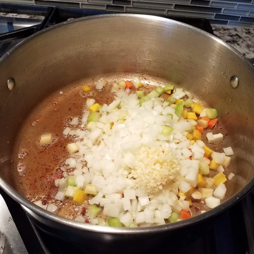 Render the bacon in a large soup pot over medium-low heat and cook until the bacon is crisp and brown seen below. Transfer the bacon using a slotted spoon to a paper towel lined plate and set aside. Leave the fat in the pot.