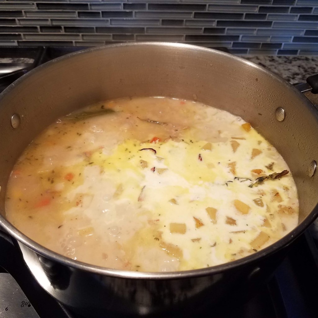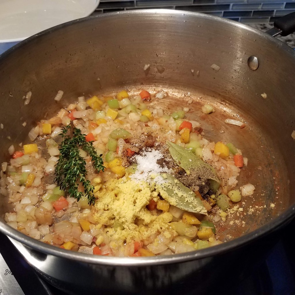Add onion, celery, carrots, and garlic to the bacon fat and cook over medium heat until the onions are soft. This will take around 3-5 minutes. Add bay leaves, thyme, chicken base, salt, and pepper to the onion mixture. Cook for a minute or so.