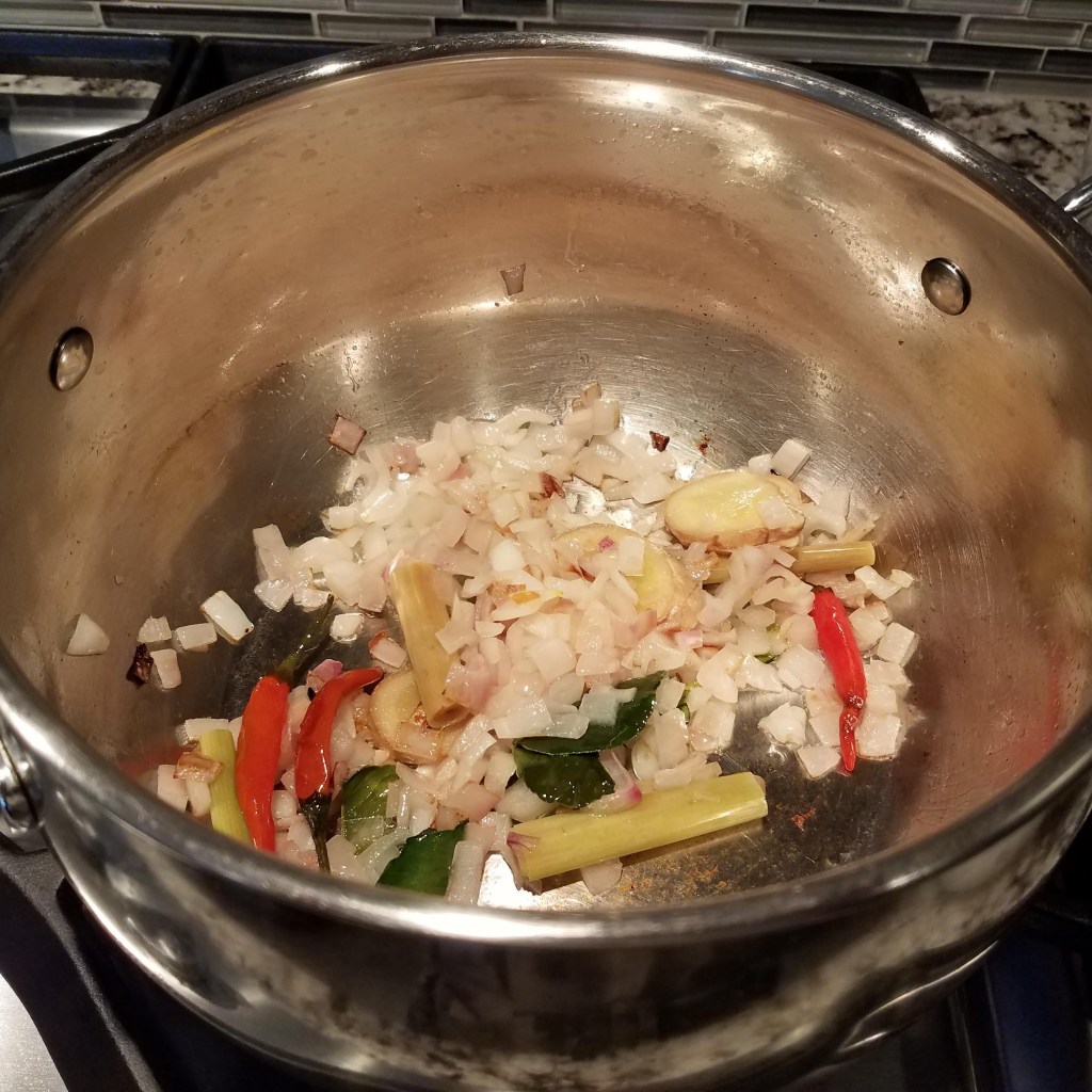 Heat 1 tbsp. of oil in a medium pot, over medium heat. Add the shallots, ginger, lemongrass, chilies, and lime leaves, stirring frequently for 5 minute or until shallots are softened.