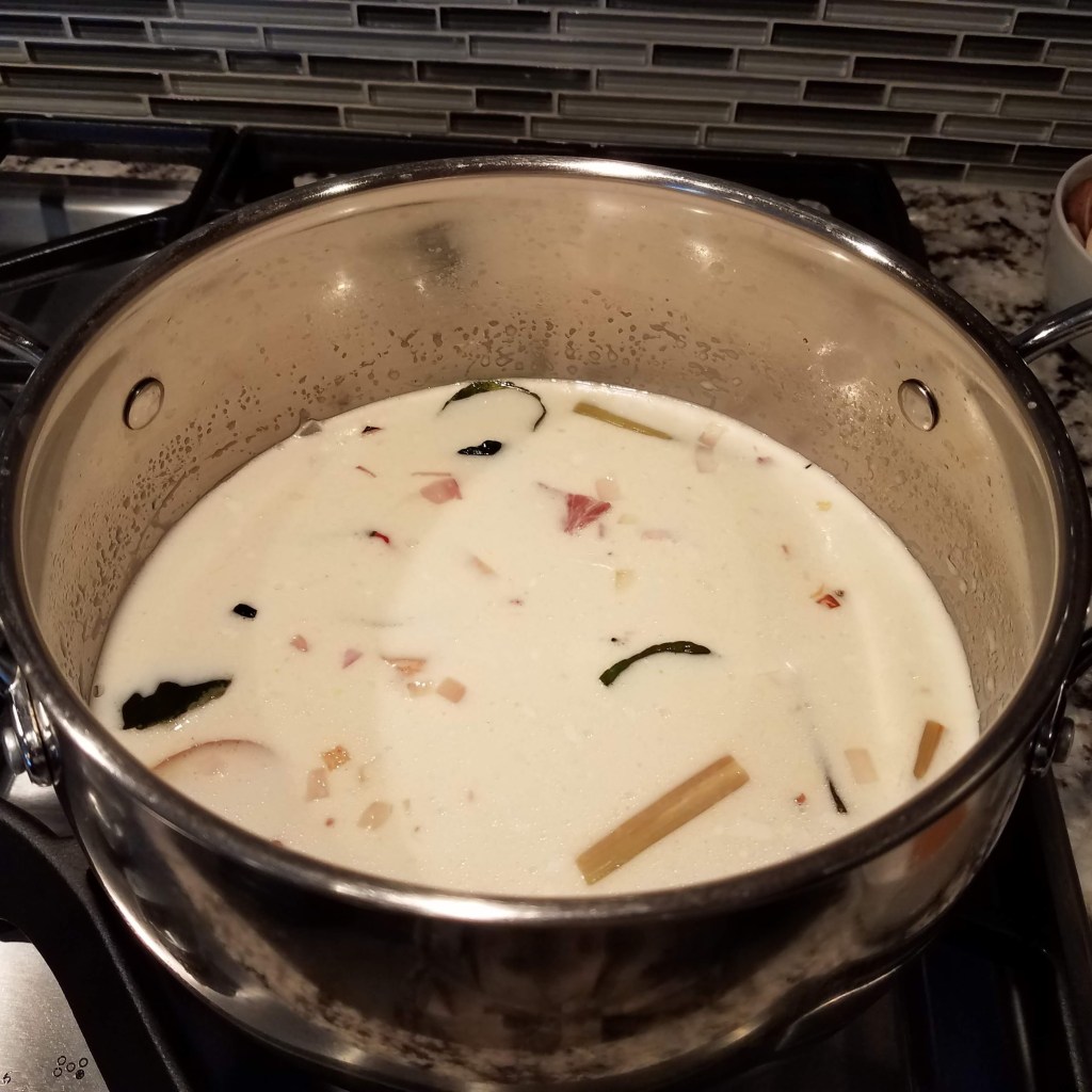 Remove lime leaves, whole chilis, lemon grass, and ginger before serving. Garnish with cilantro, extra lime, and few slices of chilis!