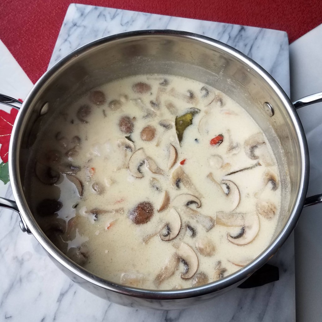 I’ve never seen Thai coconut soup made from ham (let me know if you have), so I decided to try it this way. In addition to ham I added some large shrimp to make it richer. I used cremini and button mushrooms, but you can use whatever mushroom is available to you. This is really a unique soup that will wake up your taste buds without being too spicy!