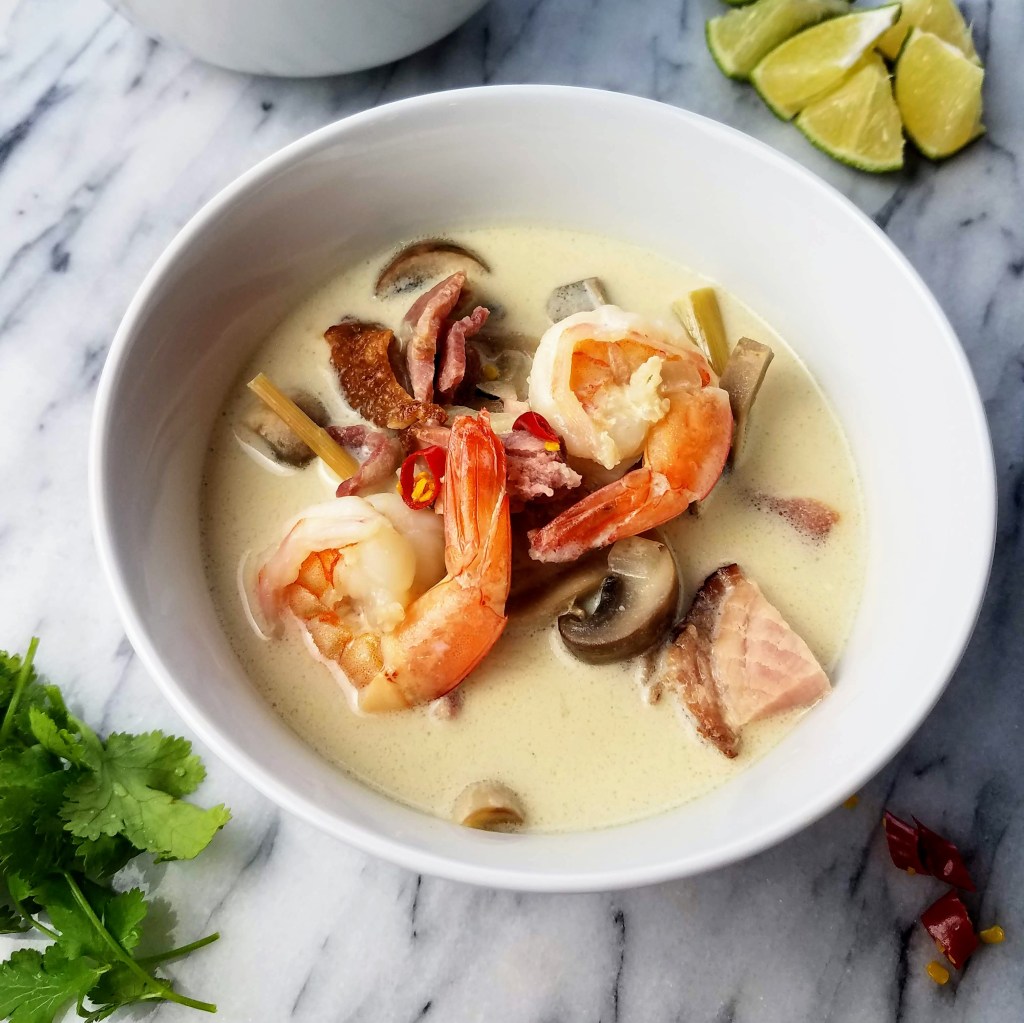 Thai coconut soup is slightly spicy and tangy — just perfect if you ask me. The spice comes from Thai chilis and the tanginess comes from lime juice. In Thailand this is called Tom Kha Gai and the recipe includes coconut milk, ginger (or galangal), kaffir lime leaves, lemongrass, and certain mushrooms. You can make it from seafood, chicken, pork, or tofu. There’s not just one way to make it.