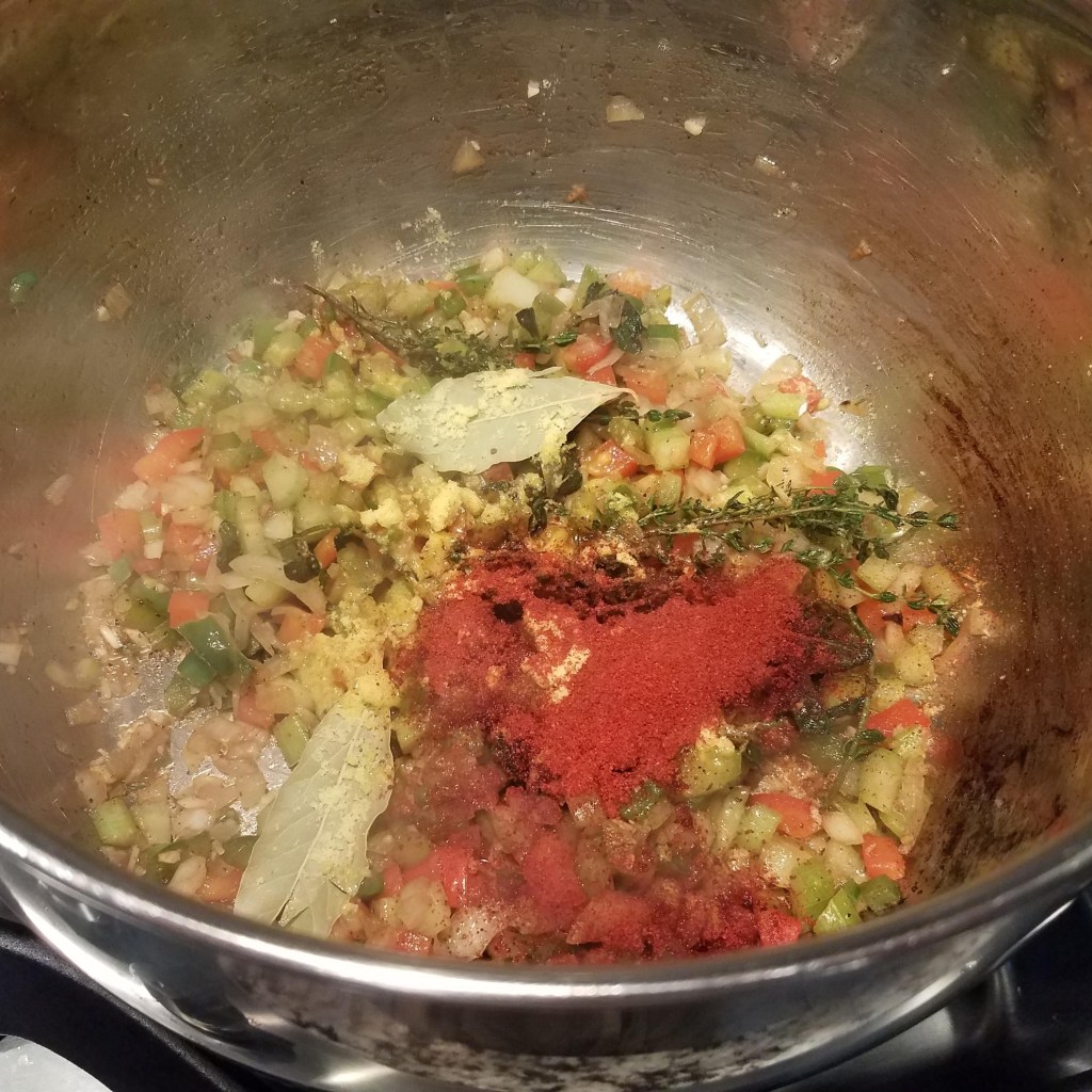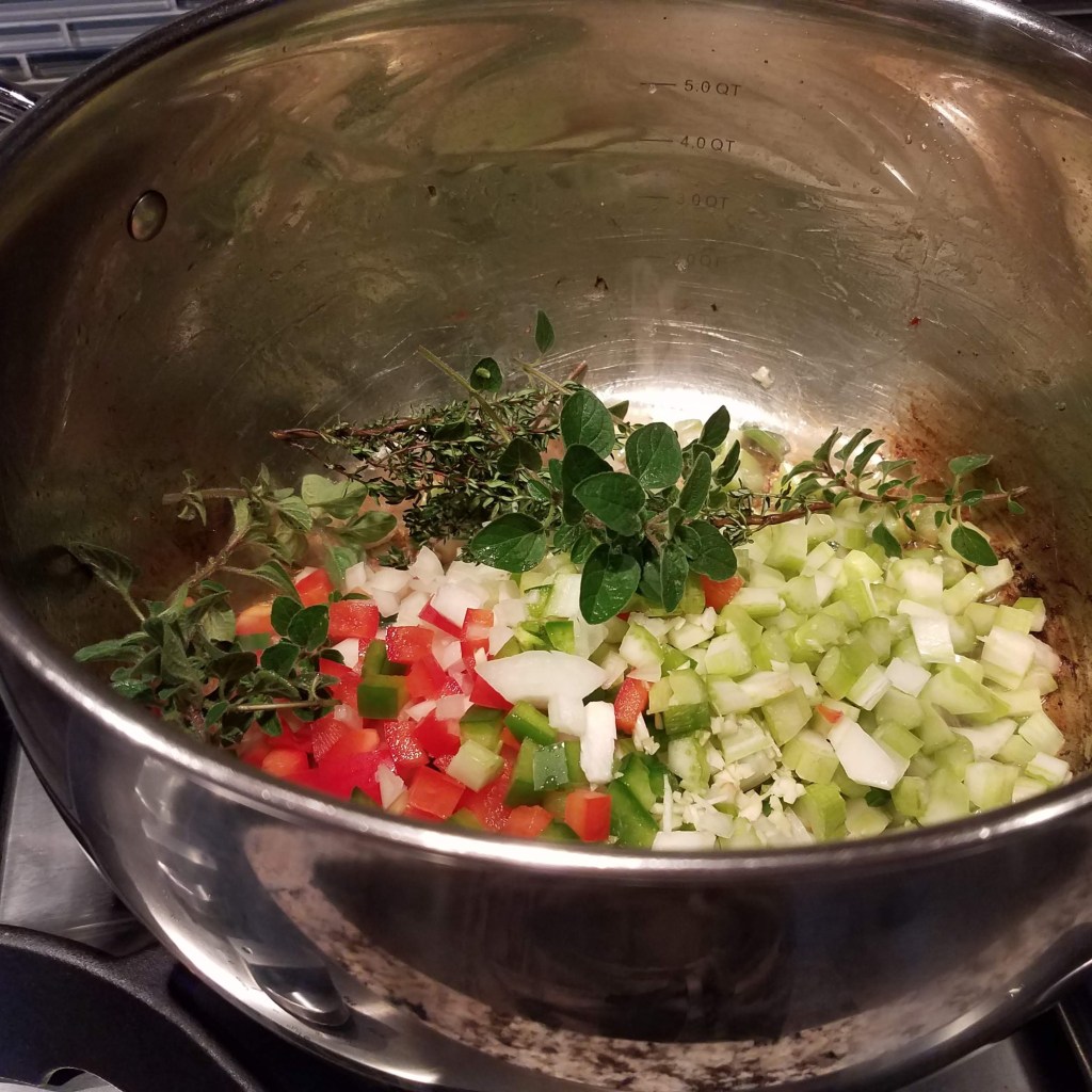 Add onion, peppers, jalapeno, celery, and if using fresh herbs (oregano/thyme) to the pot with the sausage fat. Sauté until the onions are translucent.