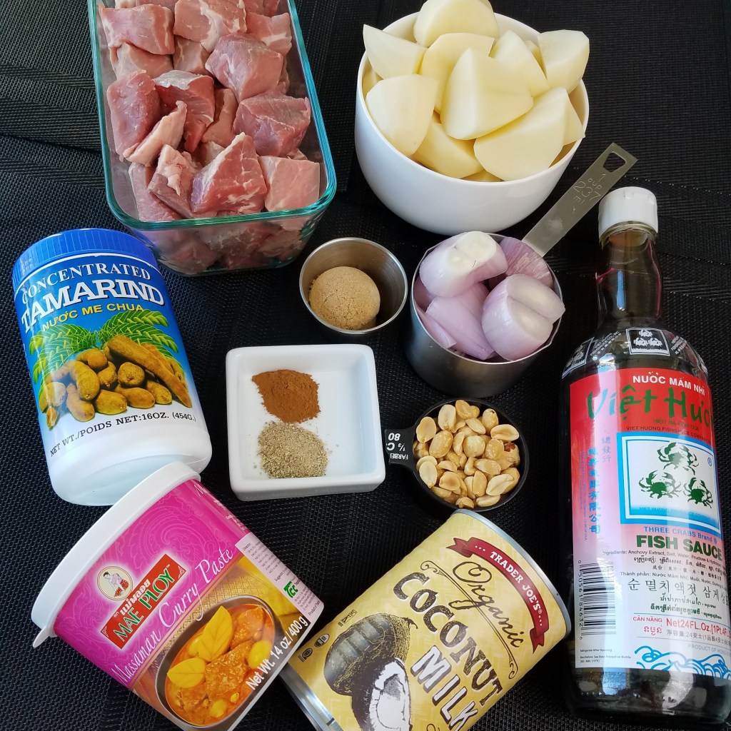 To make the curry, first fry the curry paste with coconut cream. After that you’ll add meat, potatoes, onions, fish sauce or salt, tamarind paste, sugar, coconut milk, and peanuts. You can make this vegan-friendly if substitute meat for tofu or tempeh.