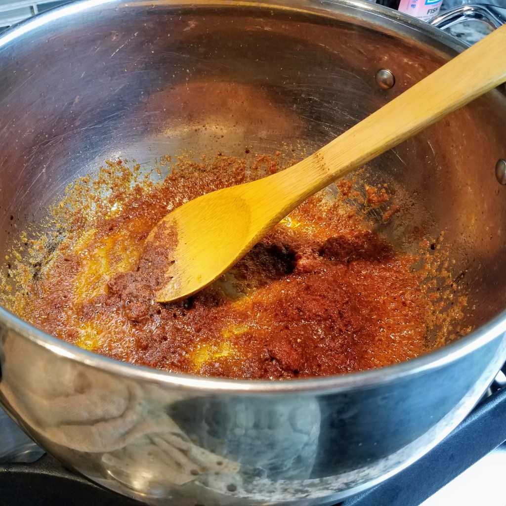 Save the rest of the coconut milk. We’ll be coming back to it later. Cook the coconut cream over medium-high heat for around 1-2 minutes, stirring often. Continue this process until the coconut milk bubbles and is reduced. Add the curry paste, cinnamon, 1/4 tsp. salt, and cardamom powder to the coconut cream. Stir the mixture, then turn down the heat to medium. Cook for 30-40 seconds, stirring to prevent from burning.