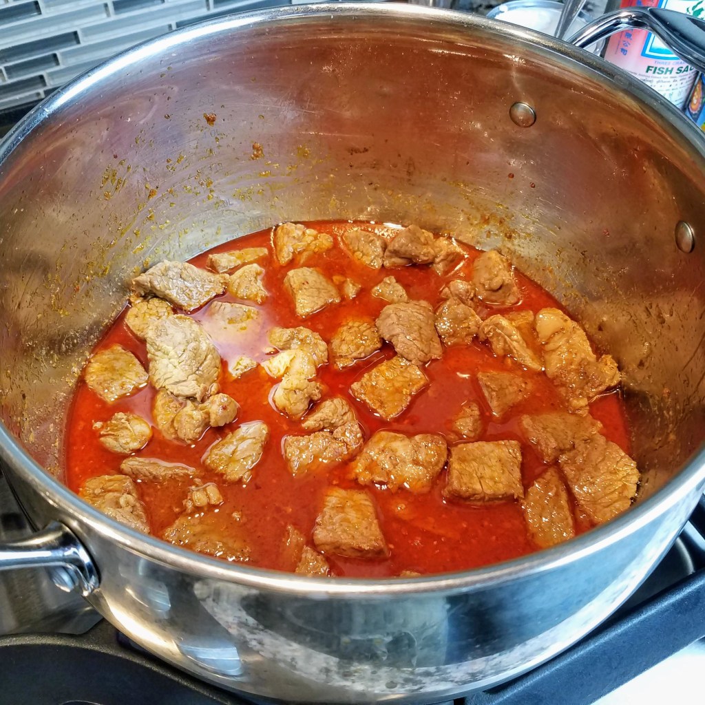 Cook this mixture until the coconut cream cracks and the oil floats to the surface. Add the beef and cook for 5 minutes, stirring often to prevent getting burnt. Add a cup of water to the beef and stir well. Lower the heat, cover, and cook the beef for an hour, keeping an eye and stirring often.