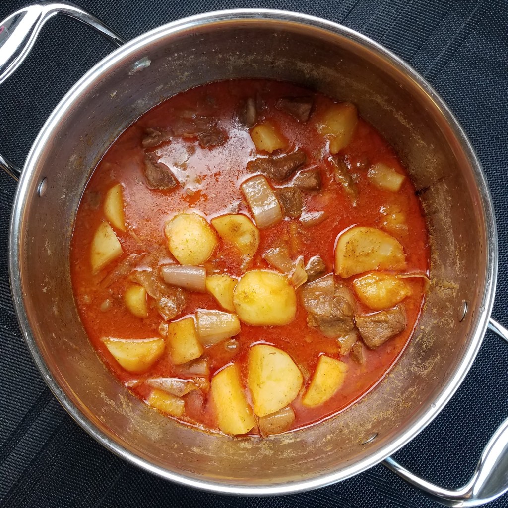 Stir well, cover and cook on low heat for 30- 35 minutes until potatoes are cook through and beef is tender. Taste for seasoning. Serve this over cooked rice and garnish with some cilantro leaves!
